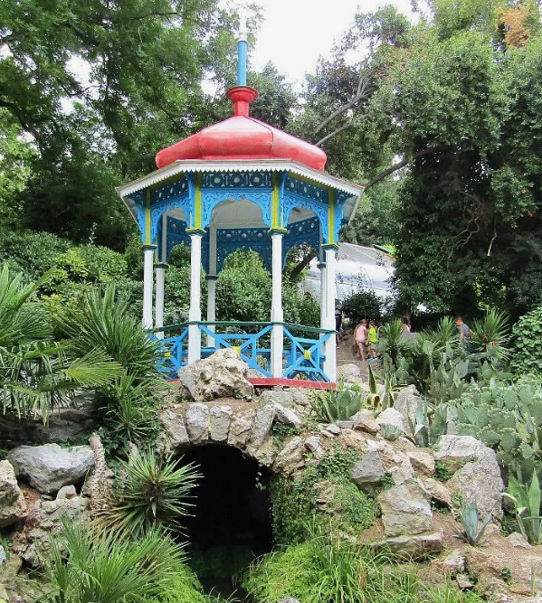 Это знаменитая арабская беседка с тонкими колоннами и крышей-куполом. Она была построена к 100-летию НБС-ННЦ в 1912 году. Отсюда открывается живописный вид на старейшую бамбуковую рощу и пальмовую аллею, созданную практически одновременно с беседкой, венчающей мексиканскую горку из роскошных южных растений.