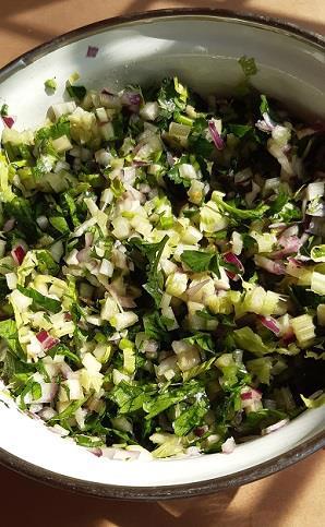 Приготовление предельно просто: всё нарезать как можно мельче, подлить масла, посыпать солью и перцем, затем тщательно перемешать.