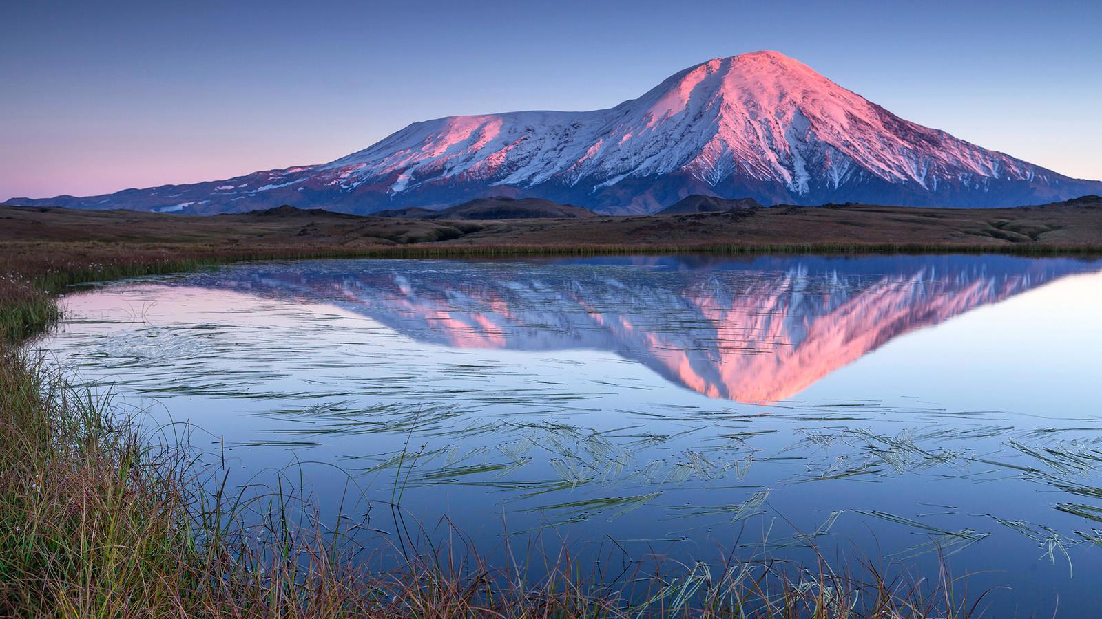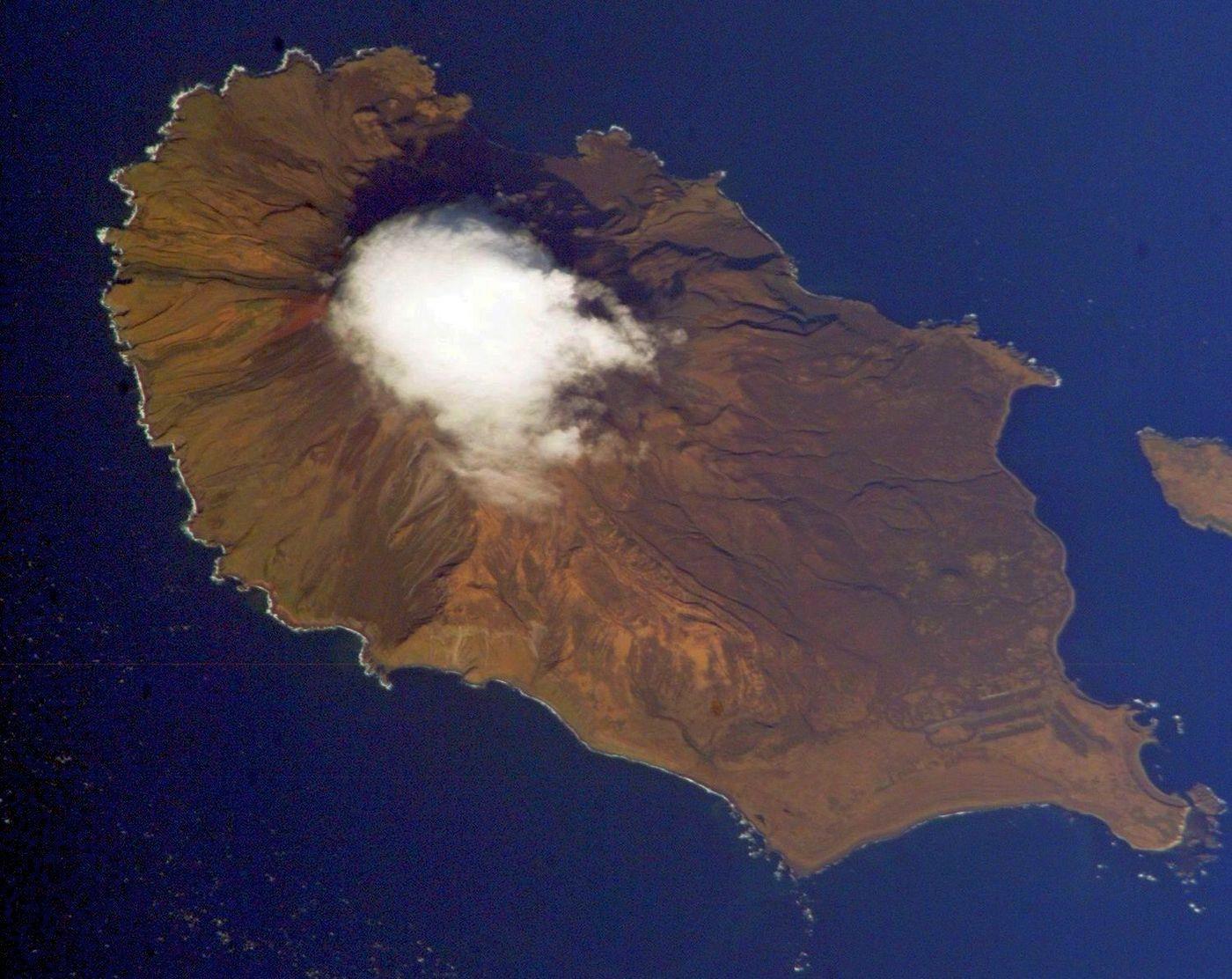 Белое облачко в середине – это не облачко на самом деле, а жерло вулкана пик Сарычева. Вулкан активный. Извержения регулярные. Самое последнее произошло в 2009 году и сильно увеличило безжизненное поле вокруг себя. Теперь оно занимает больше половины территории острова.