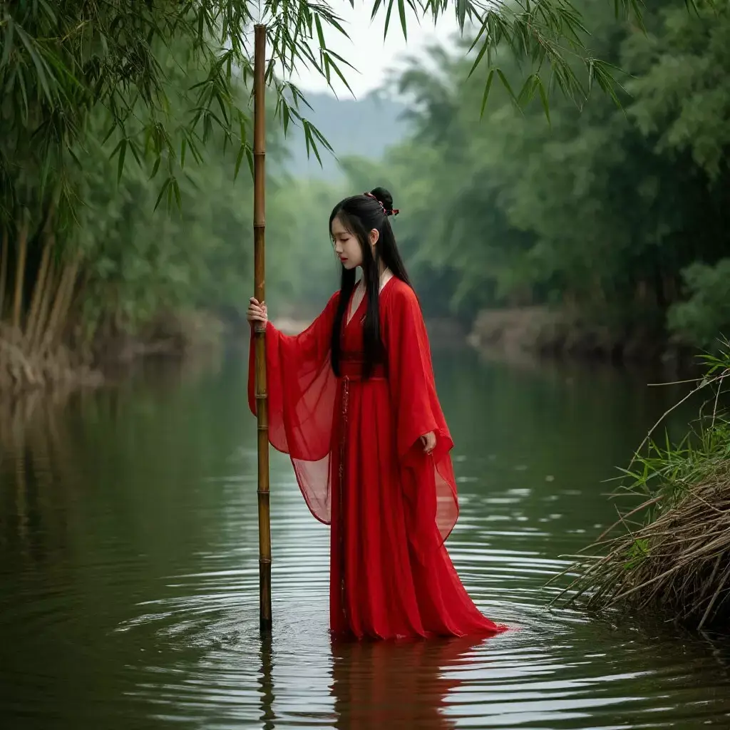 Люй Инчжэнь погрузила конец трости в воду сначала с одной, а затем с другой стороны, выводя бамбуковый стебель на середину речушки.