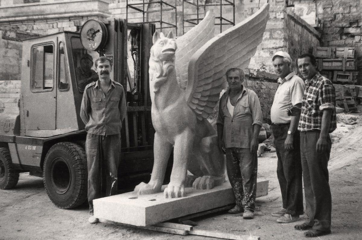 Самые роскошные, красивые и величественные грифоны были изготовлены и установлены на Большой митридатской лестнице в 80-ые годы прошлого столетия. Тогда проводилась реставрация лестницы, в ходе которой были найдены останки старых скульптур грифонов. Решили создать новые фигуры, работали трое скульпторов: Роман Сердюк (его имя теперь носит школа искусств), Александр Мельник и Виктор Будин. 1987 году грифоны были готовы и украсили собой лестницу.