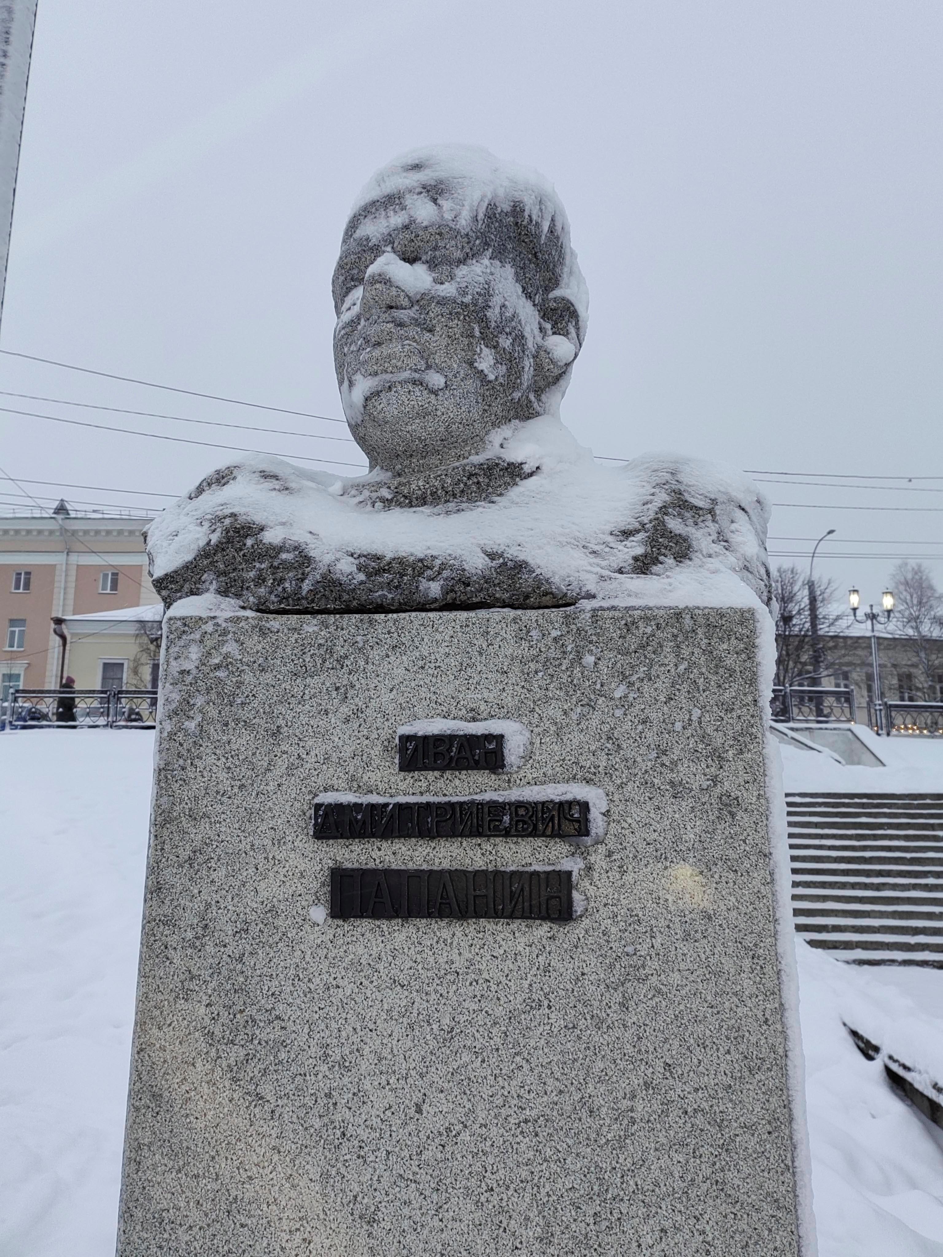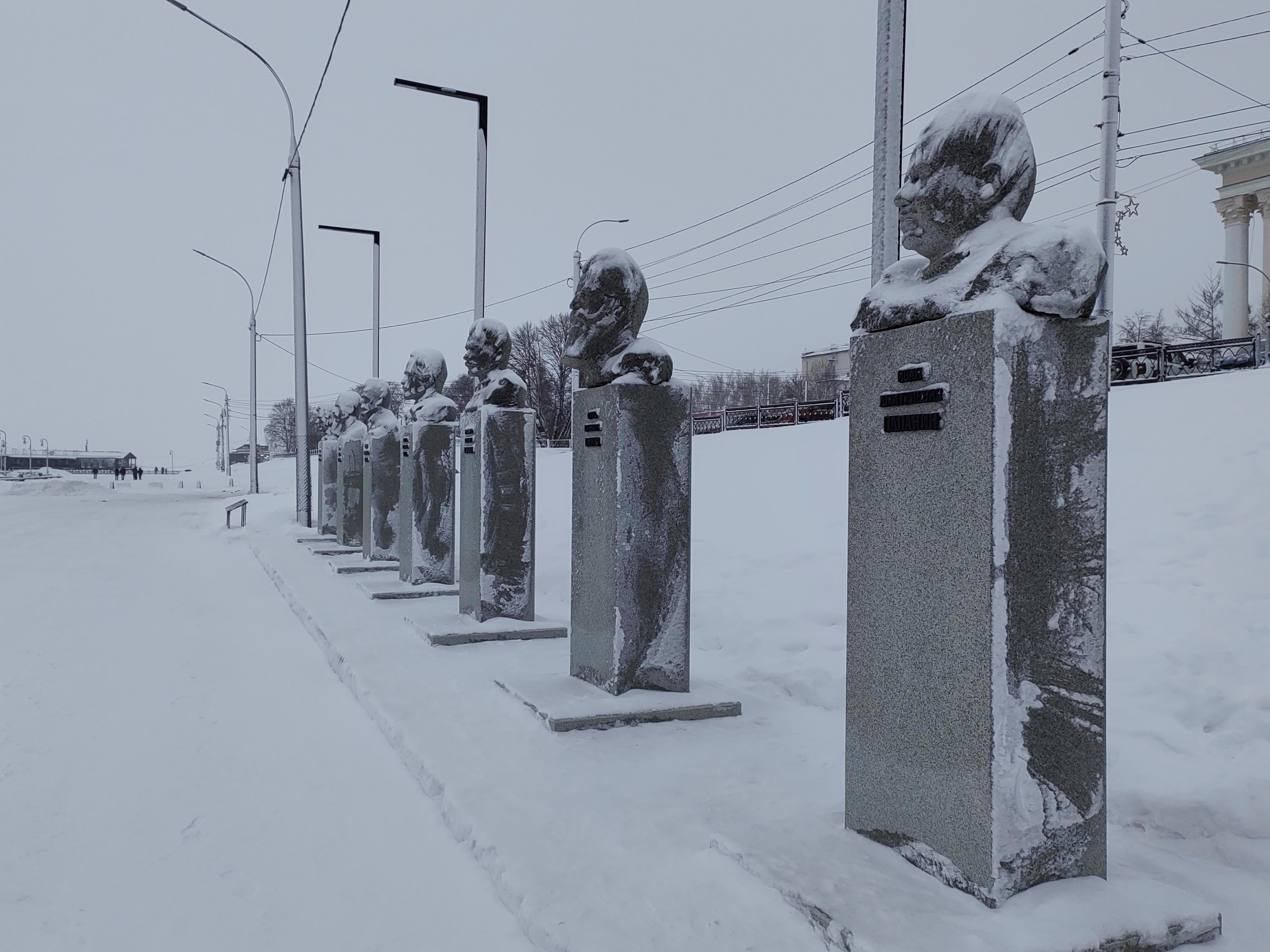 Пока я к нему перемещался началась метель, да такая что почти запорошила бюст Папанина и других знаменитых личностей, что выстроились у входа.