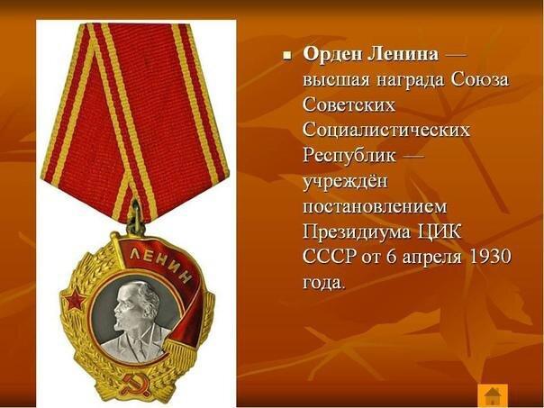 Орден Ленина являлся высочайшей наградой СССР, им награждали за особо выдающиеся заслуги в революционном движении, трудовой деятельности, защите социалистического отечества, становление дружбы и сотрудничества меж народами, укреплении мира и прочие особо выдающиеся заслуги перед государством и обществом.
