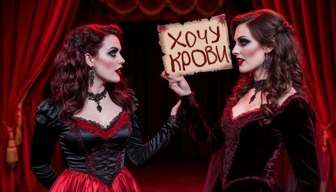 Встречаются две вампирши. Одна несёт транспарант с надписью: «Хочу крови».