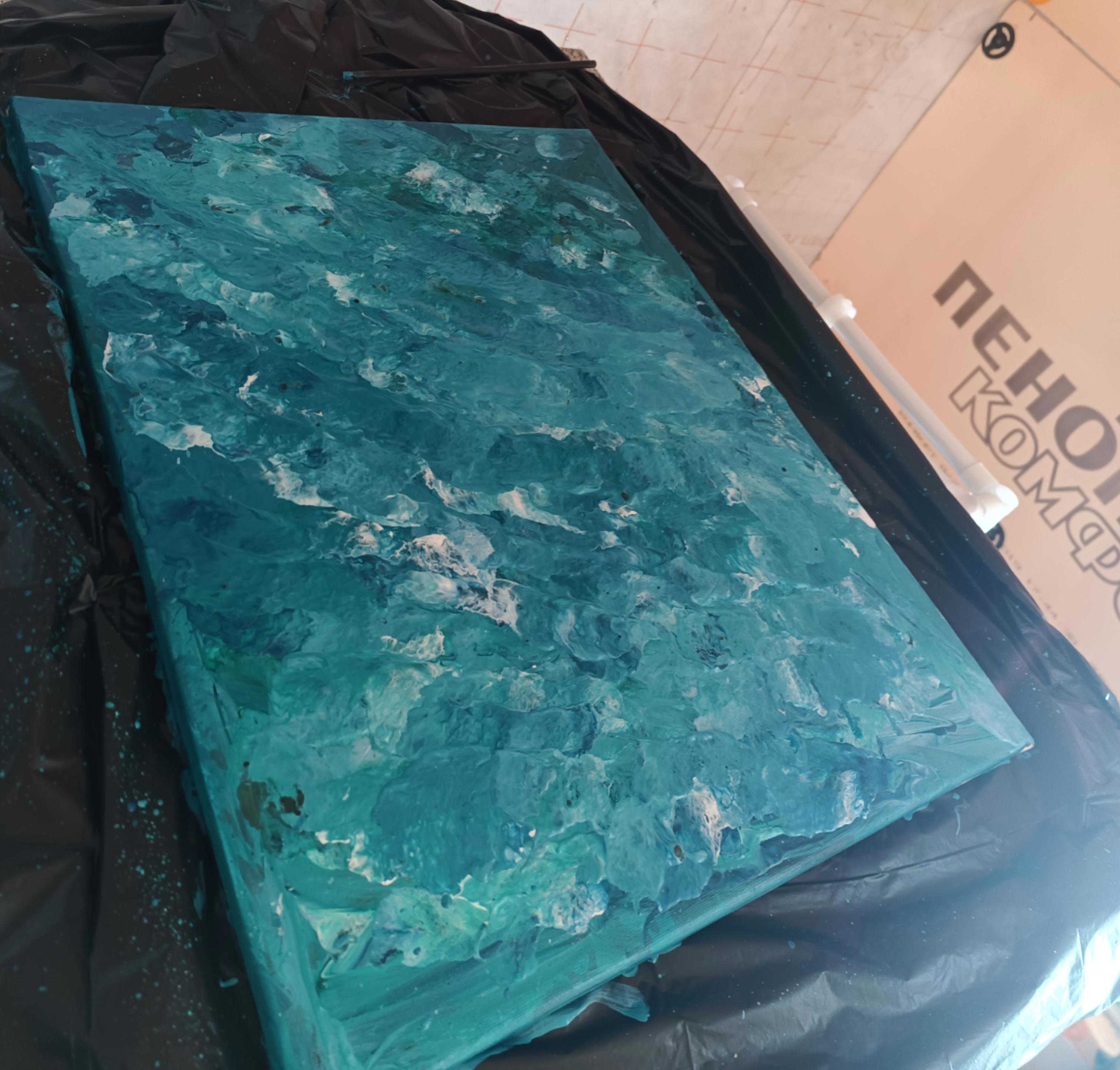 Первый опыт абстрактной живописи. Купила себе со скидкой акриловые краски флюид и изгваздала кухню... И собаку немножко. Теперь у меня есть ризеншнауцер с синей бородой))