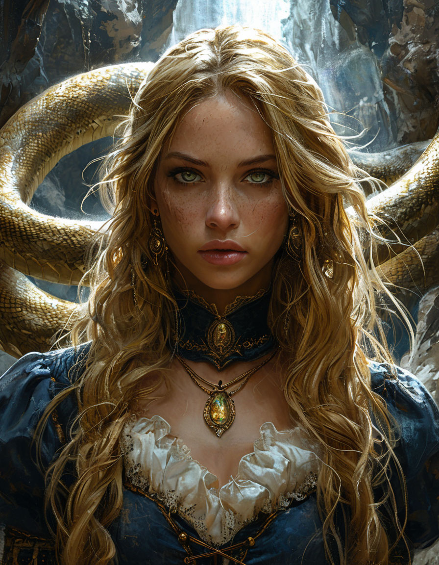 За своей спиной она услышала громкое шипение, которое издают змеи, если их потревожить. Но этот звук был настолько громоподобным, что казалось, доноситься он из огромной метровой пасти. В столбе яркого света стали появляться очертания свернувшейся змеи, склонившей свою треугольную голову с черными щелками желтых глаз. Ее чешуя переливалась цветами расплавленного золота. Чем яснее становился силуэт, тем отчетливее был слышен звук трущихся чешуек при разматывании колец этого гибкого мощного существа.