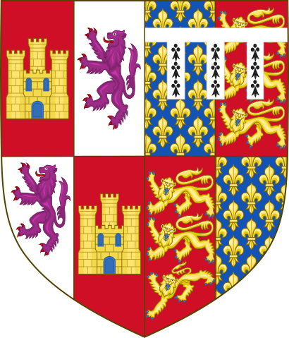 Вроде есть что-то знакомое, да? Львы на месте, лилии Франции тоже... А с левой стороной что? А это герб королевства Кастилии. То есть, Джон из Гента(он же Джон "Гонт" Плантагенет), был одновременно герцогом Ланкастера и претендовал на Кастильскую корону, так как был женат на Бланке Кастильской.