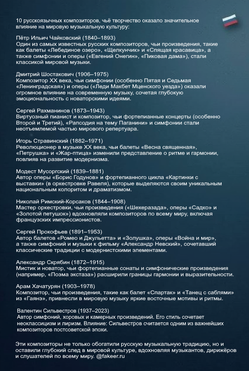 Эти композиторы не только обогатили русскую музыкальную традицию, но и оставили глубокий след в мировой культуре, вдохновляя музыкантов, дирижёров и слушателей по всему миру.
