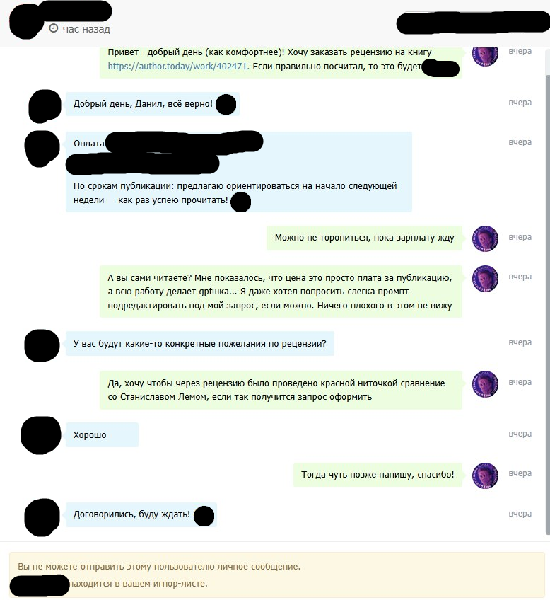 Автор: Данил СчастливыйКратко: Я провёл небольшое расследование о человеке, который продаёт рецензии, выдавая, СКОРЕЕ ВСЕГО, нейросетный текст за свой. Поговорил с авторами, проверил стиль, получил почти признание — и теперь хочу предупредить тех, кто ищет честную обратную связь. История не про разоблачение ради хайпа, а про важную грань между рекламой и рецензией. Подробности — ниже.