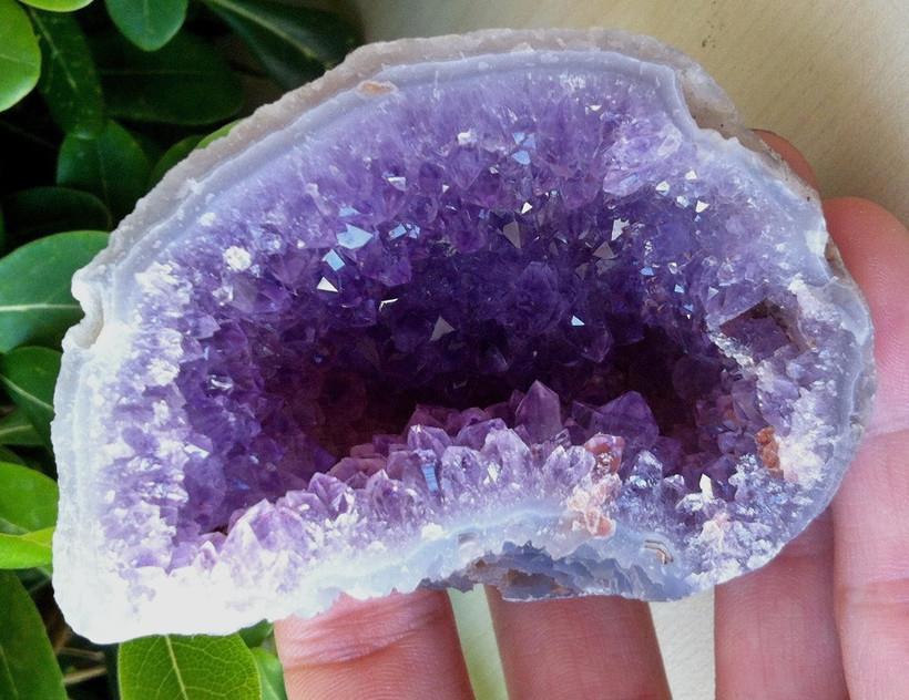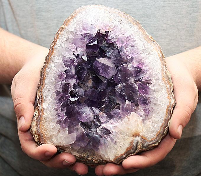 Это явление называется "жеода" – образование минералов внутри самого обыкновенного камня, чаще всего осадочной или вулканической породы. Сначала в горной породе формируется полость, как правило, из пузырьков газа и воздуха, которые образуются от незастывшей магмы или просто проникают в трещины на поверхности камня. Потом внутрь этой полости начинает проникать раствор различных минеральных веществ, который вступает в реакцию с кислородом, различными солями и той породой, которая уже присутствует на образовании. Вследствие химической реакции на стенках полости выпадает осадок, который застывает и формирует различные виды таких жеод: от невзрачных кварцевых до дорогостоящих аметистовых и хрустальных. Сама по себе жеода редко бывает чистой, потому что в процессе формирования участвуют различные минералы и соли. На многих примерах можно найти жеоды, состоящие из кварца и аметиста, кварца и агата, кварца и чего-нибудь еще. Но в самом "сердце" жеоды всегда можно найти чистейший камень глубокого, насыщенного цвета без примесей.