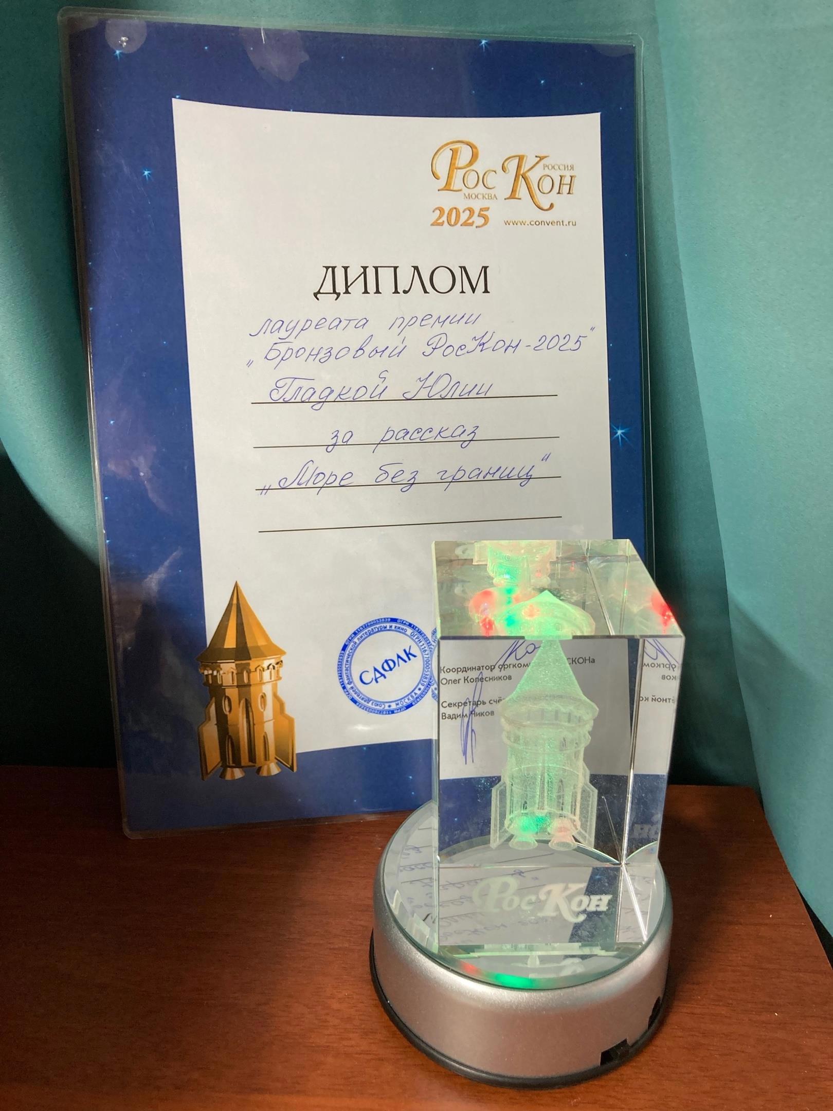 Посетила лекции, участвовала в Рассказе за час, который вела Мария Васильевна Семенова. В общем классно было. Но самый пик восторга оказался на закрытии. Мой рассказ Море без границ, у которого крайне тяжёлая судьба в литературном плане, наконец нашел себя! и принес в мою коллекцию приз за лучший фантастический рассказ 2024года. Бронзовый РосКон (3 место)