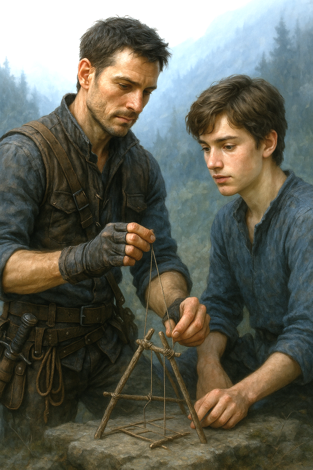 Он продолжал показывать одну ловушку за другой, начиная от простых, вроде ловушки с верёвкой, которая мгновенно поднимала человека в воздух, до более сложных, которые требовали точности и умения. Среди его зрителей был молодой парень по имени Тарен, который быстро проявил смекалку и интерес к каждому трюку. Он задавал вопросы, порой перебивая самого Финна, и вскоре начал применять увиденное на практике, создавая собственные версии ловушек.