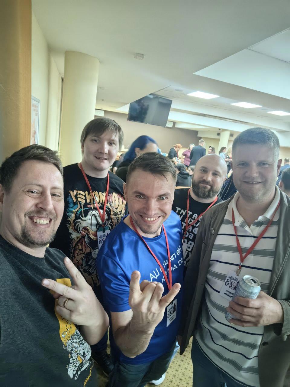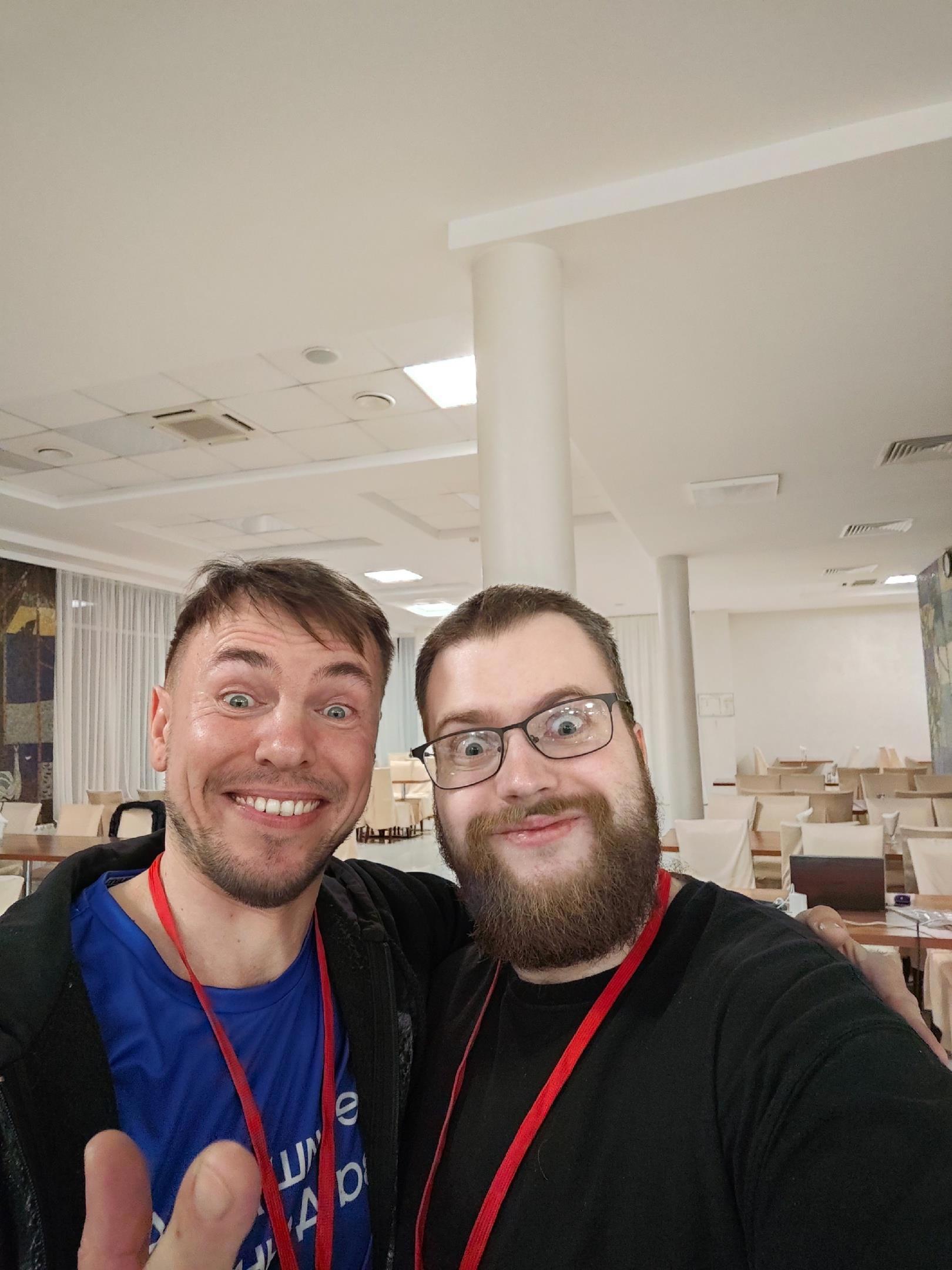 После ужина подъехал Сергей Шапин и мы своей теплой АТ-ой тусой собрались в нижнем конференц-зале. Шаман открыл вечер, и это было самое короткое вступительное слово, которое я когда-либо слышал. А дальше пошло общение под напитки разной градусности, поэтические баттлы, крокодил, фотосессии и прочее. Погуляй привез литр самогона на копченой груше и две банки домашних соленых огурчиков — за уши не оттащишь, а голова при этом светлая и легкая! Лично для меня этот движ выдался самым душевным и запоминающимся из всего мероприятия.