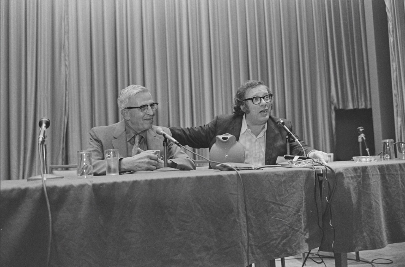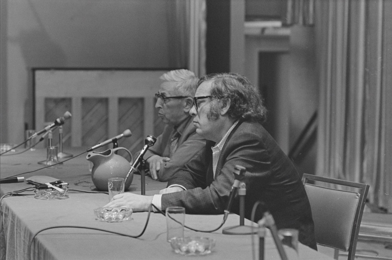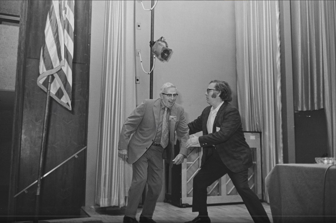 И чтобы мой пост не выглядел слишком уж пресным, добавляю в него раритетные фотографии мэтра (коих сохранилось не так уж и много), на которых он запечатлён с другим легендарным творцом Айзеком Азимовым. На дворе 1971-ый год. Писатели участвуют в 29-ом Мировом Научно Фантастическом Конвенте (Noreascon-I). Ровно через четыре года Саймак заявит что как писатель он выходит на заслуженную пенсию (но писать, тем не менее, всё равно не бросил).