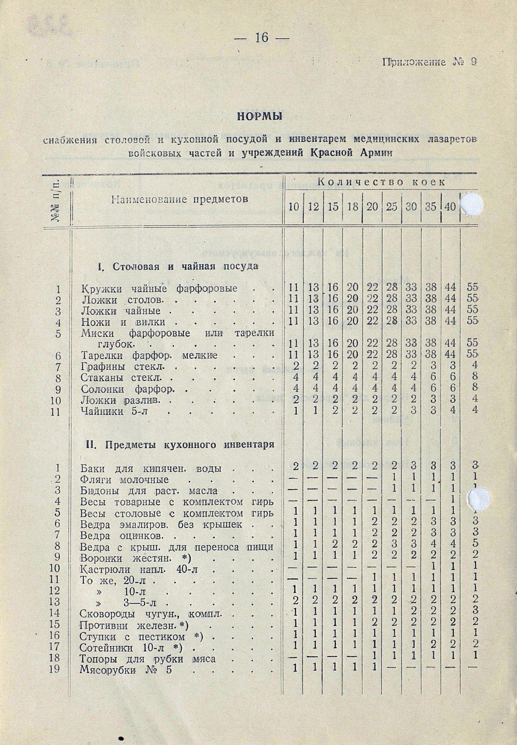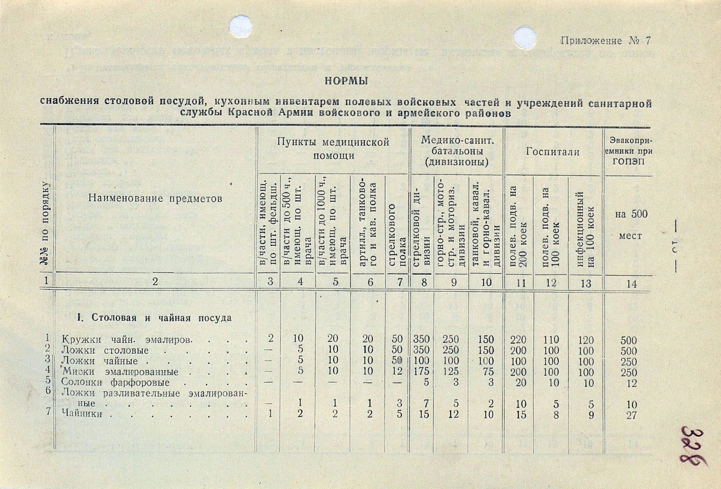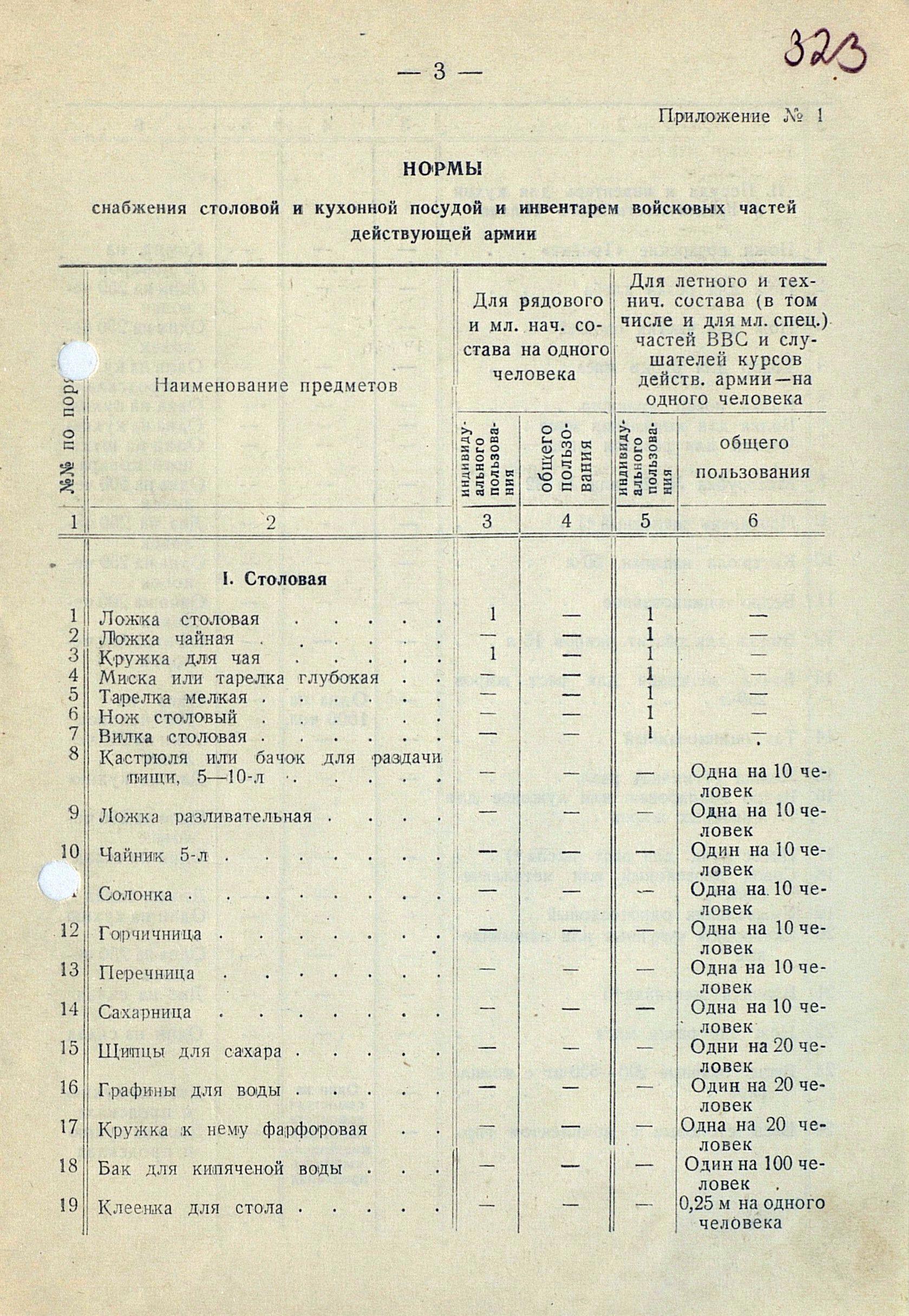 Нормы снабжения Красной Армии столовой и кухонной посудой. 1943 г.