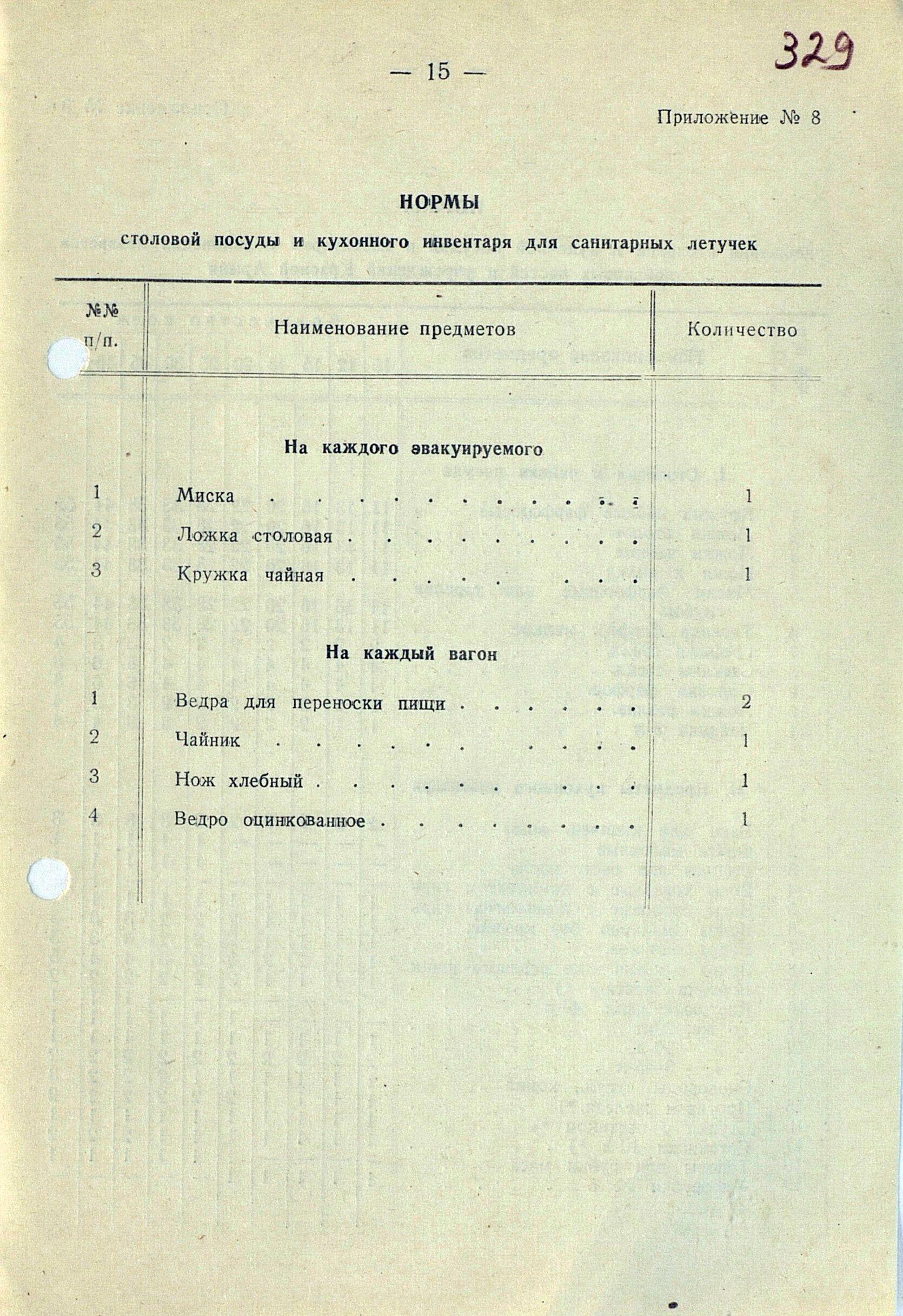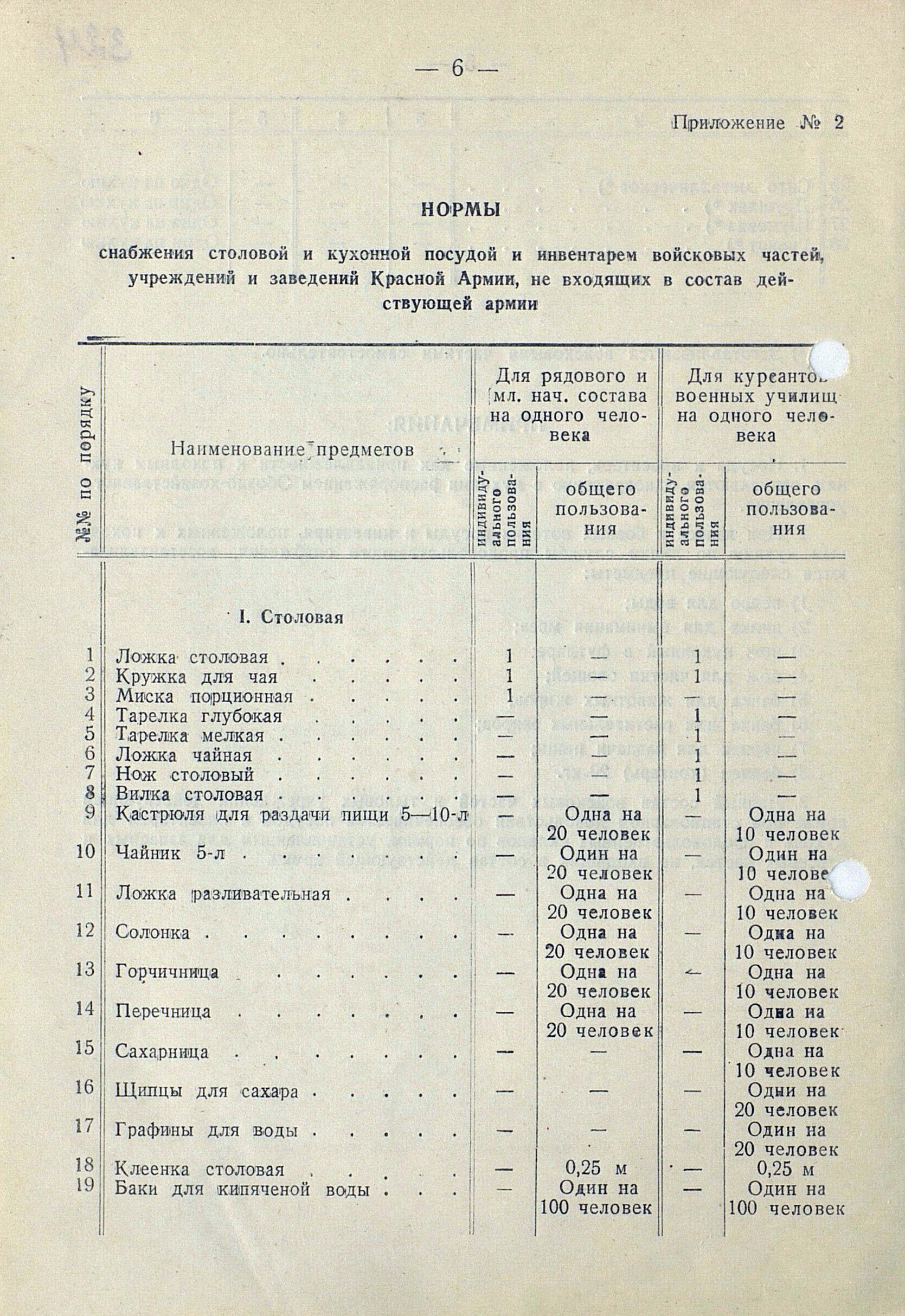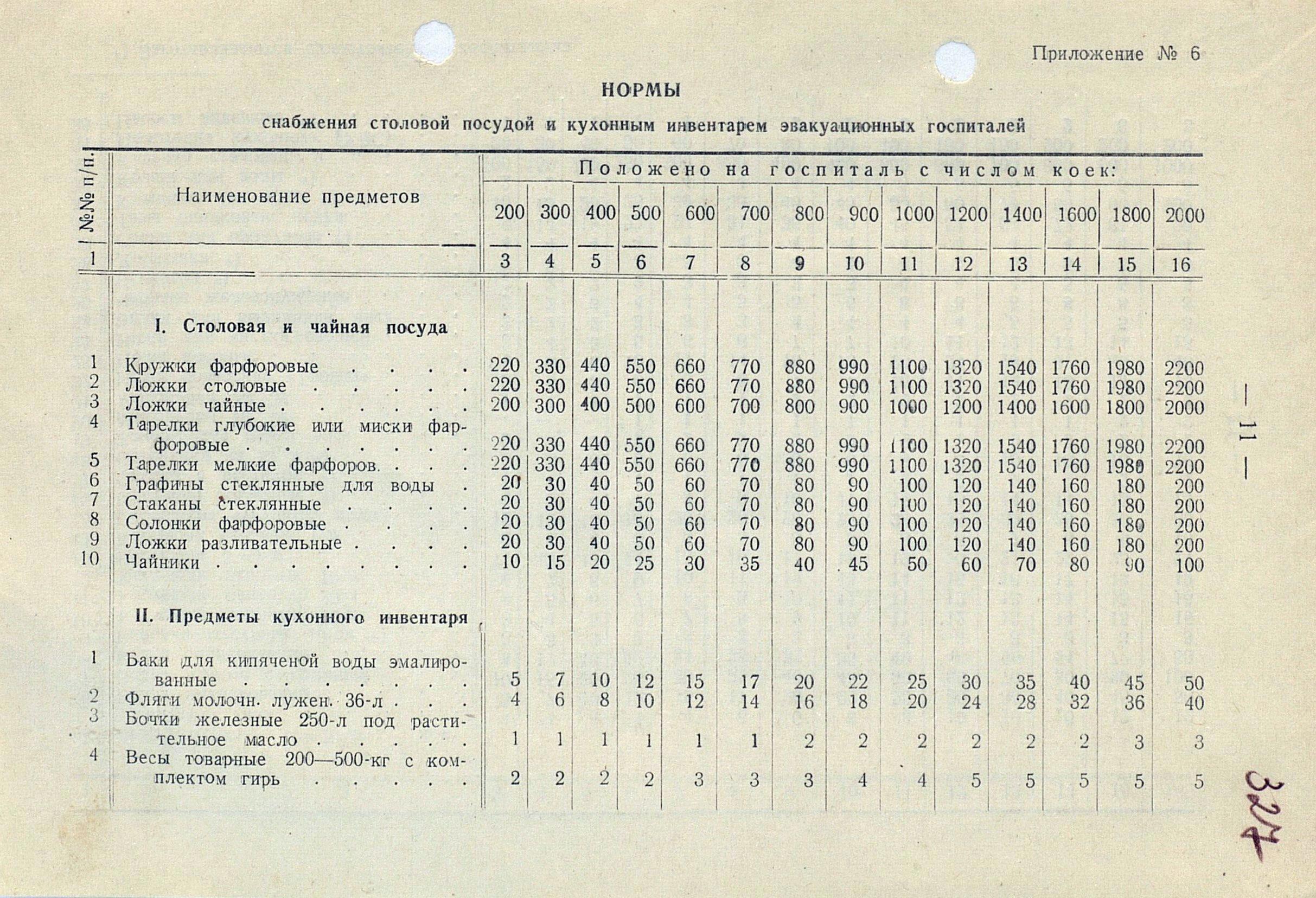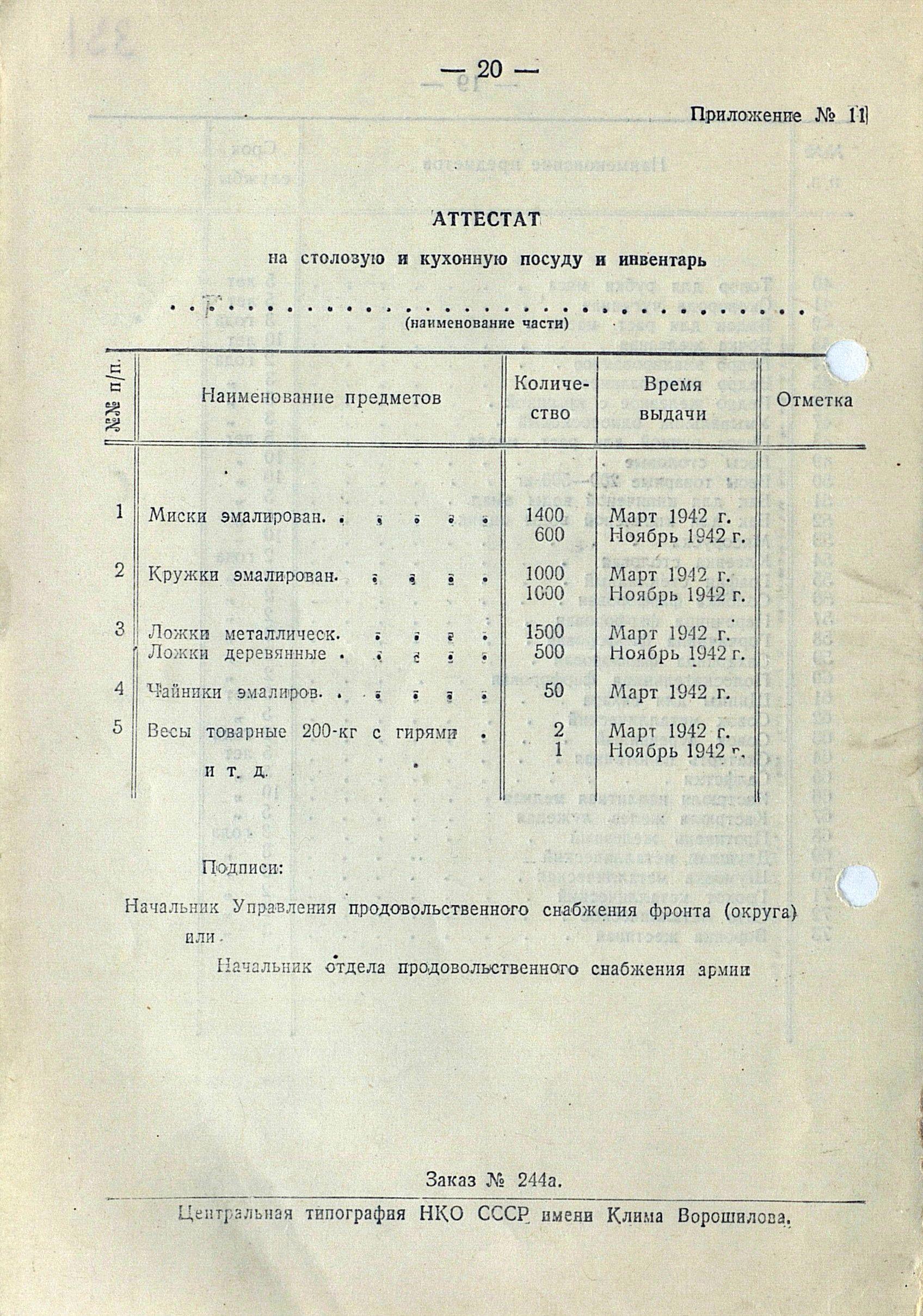 Нормы снабжения Красной Армии столовой и кухонной посудой. 1943 г.