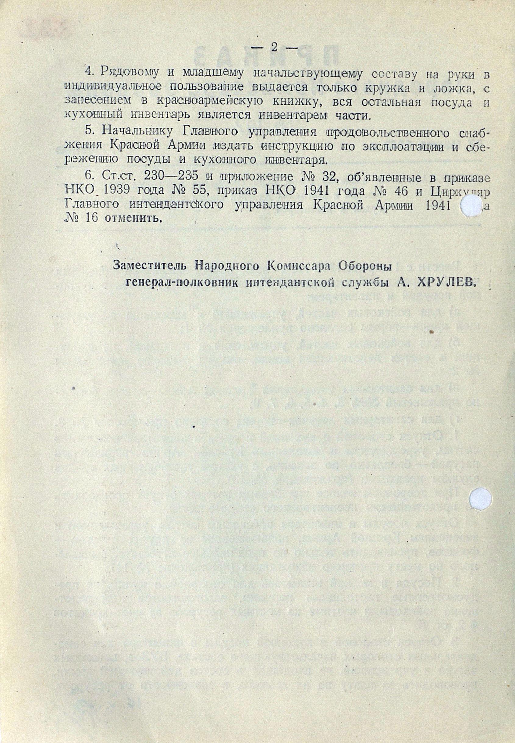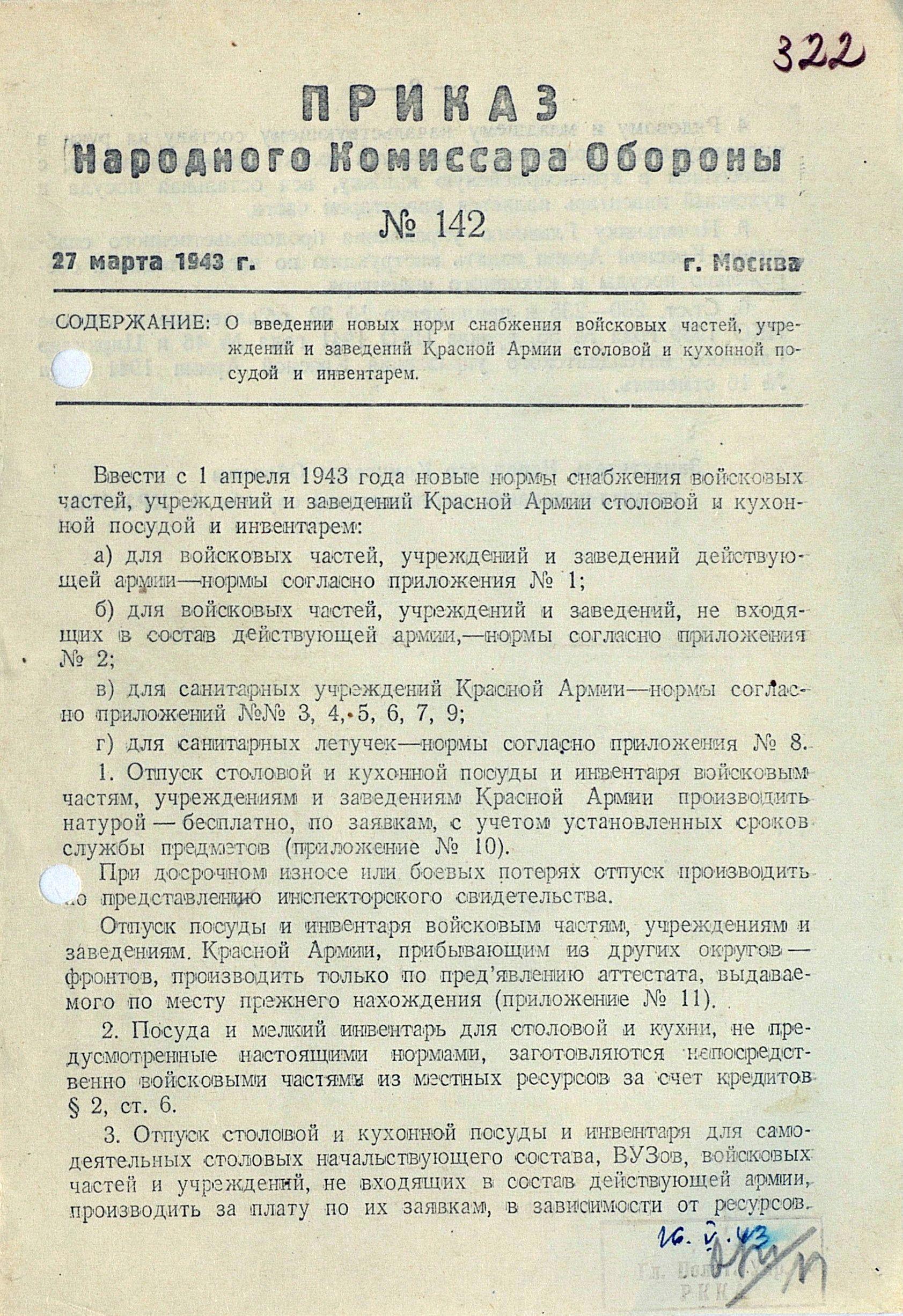 Теперь остаётся найти пару приказов Наркома обороны да циркуляр Главного интенданта Красной Армии, отменённые этим приказом, да перечень посуды и инвентаря, положенные в комплект к походным кухням и можно считать, что с этим вопросом почти разобрались. Ну, если случайно не попадётся что-нибудь ещё, например похожие приказы Наркомата ВМФ. Вряд ли они будут сильно отличаться от нормативов НКО, но сравнить было бы любопытно.