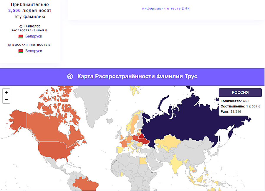 Возьмем, к примеру фамилию "Трус" и посмотрим, сколько людей в мире имеют эту фамилию (сайте https://forebears.io/ru/surnames/trus)