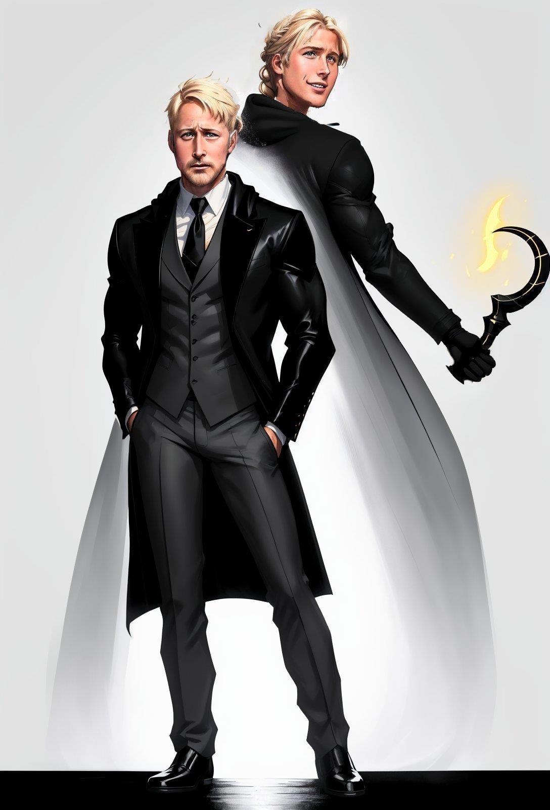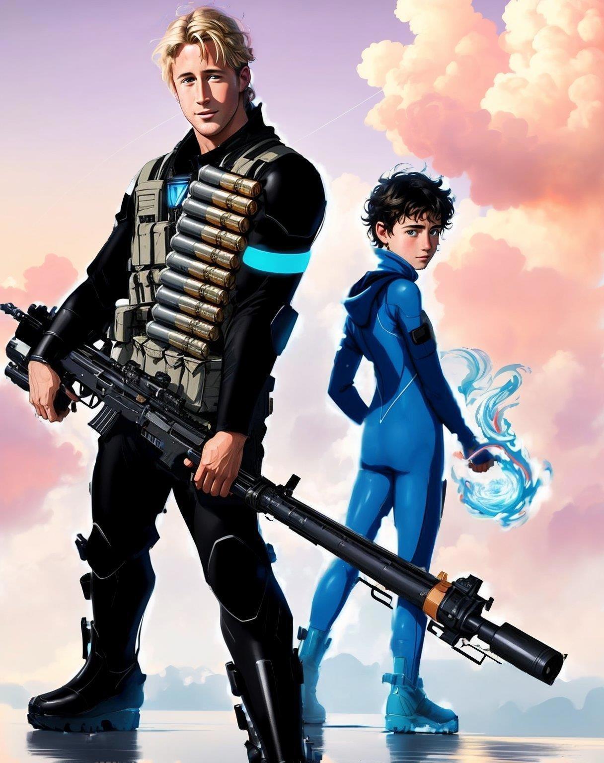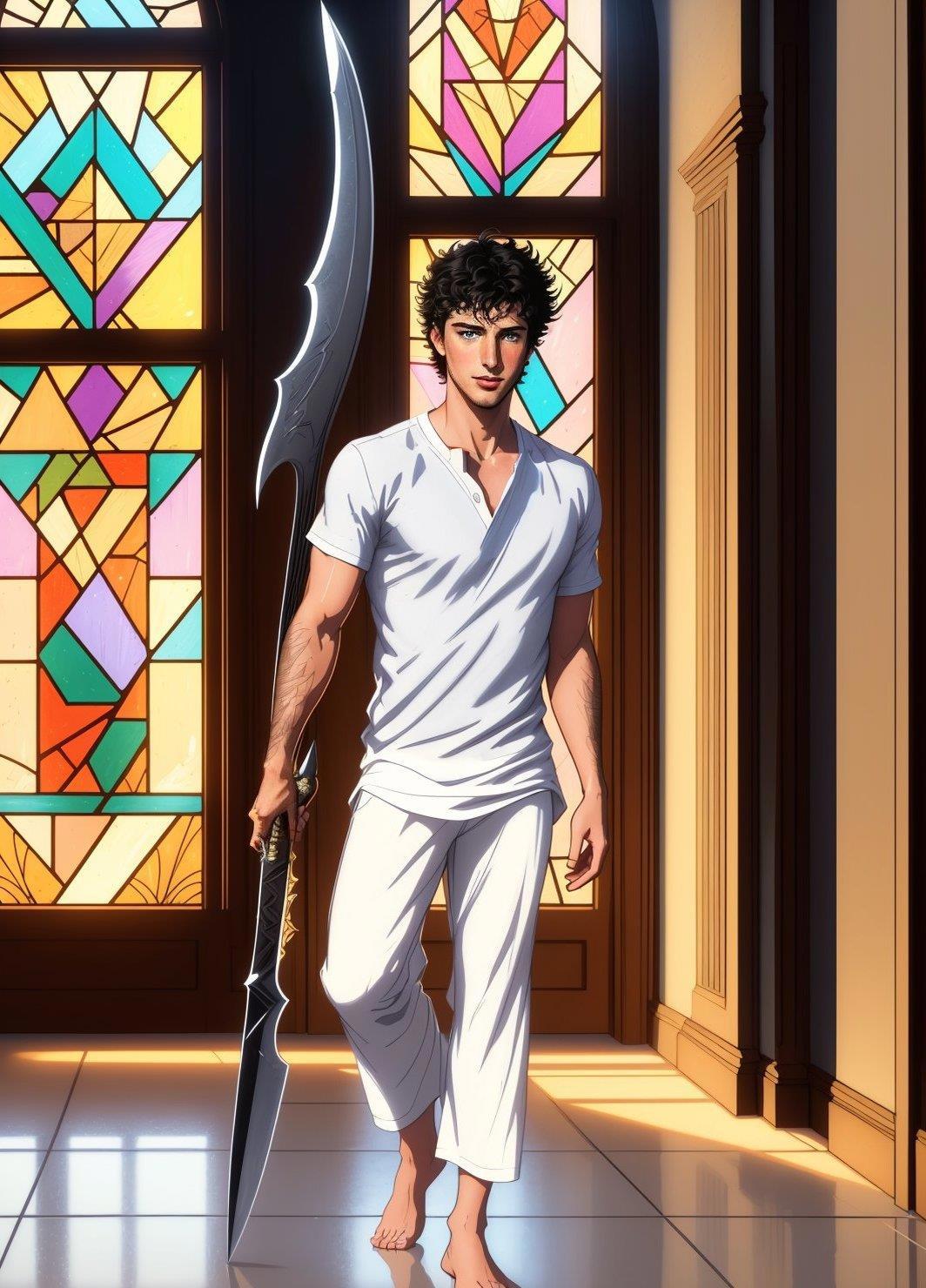 Один из второстепенных персонажей, но блин, как же тяжело было добиться нужной позы! Пришлось дважды переворачивать картинку в процессе обработки, потому что Diffusion неадекватно обрабатывает силуэты вверх ногами.