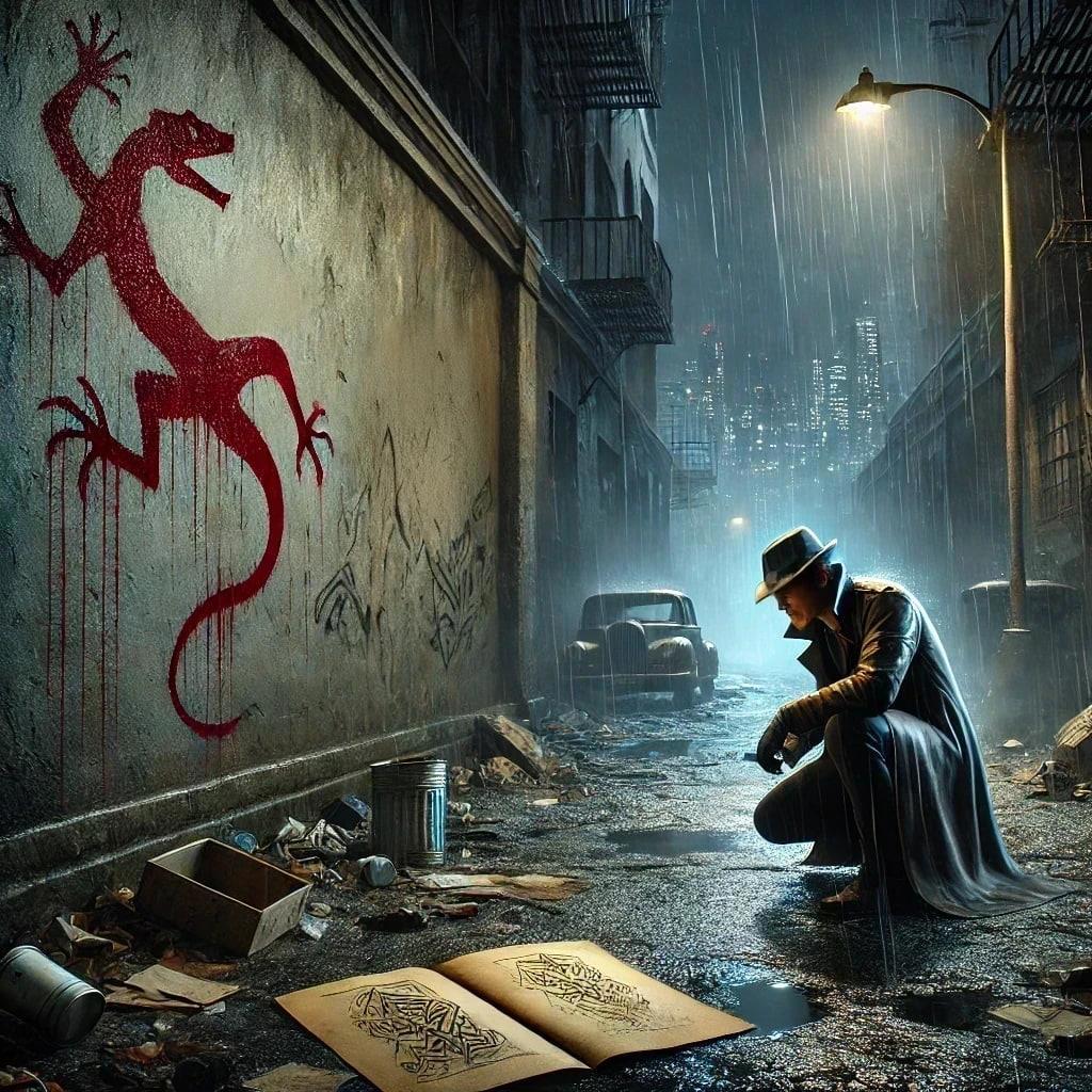 Тут я заметил алый след на стене. Пятно крови, едва различимое на фоне чёрной грязи, заставило меня остановиться. Я присмотрелся: кровь была свежей. Кто-то явно пытался это скрыть. Мой взгляд переместился на знакомый символ — стилизованная ящерица. Её следы я уже встречал несколько раз: на зажигалке Лилы, портсигаре, даже на фамильном гербе, образ которого я потрудился поискать в паре справочников о самых богатых семьях Веридиана… Теперь она снова здесь, нарисованная на грязной кирпичной стене. Совпадение? Вряд ли.