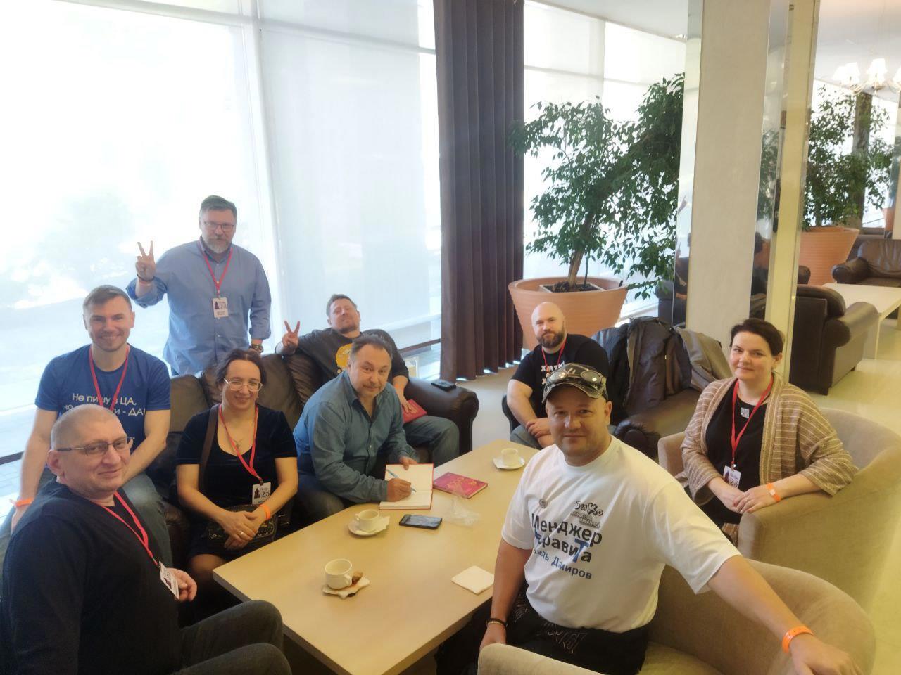 Вообще забавно. Я первый раз приехала, почти никого не знала лично. А вижу плоховато. Идёшь по коридору, щуришься на бейджики и периодически: