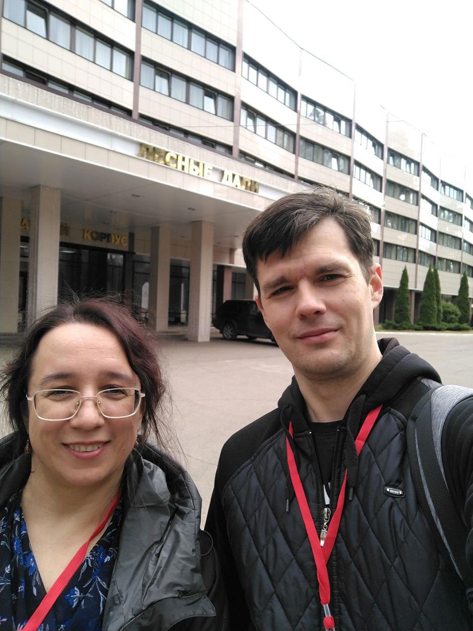 ЗЫ: А это отличный автор и пламенный читатель Олег Дмитриев, которому очень понравился наш последний цикл про Илюху Коршунова. Вот мы на фоне, собственно, главного жилого корпуса, где проходил Роскон))