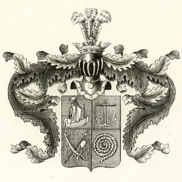 Там, судя по заголовку, был представлен герб рода Еремеевых: помещенные в поле щита корабль, якорь, скрещенные меч и бердыш, а также свернутый канат.