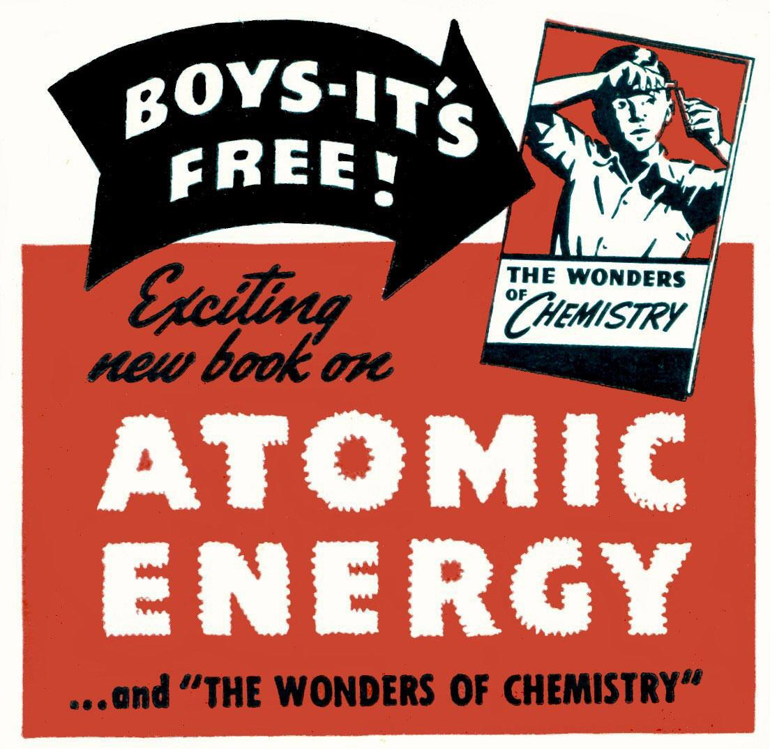 Набор для юных химиков. Интересно, правда в него входили радиоактивные вещества или просто для рекламы написали про атомную энергию? Времена стояли такие, что вполне могли соли урана или тория в набор включить