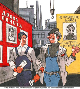 Еще и уравниловка, т.е. перераспределение богатств от тех, кто честно работает к тем, кто работает спустя рукава. Иначе при социализме никак: ведь отстающий тоже хочет есть, у него семья, а государство обещало всех накормить. И мер воздействия на него мало, ведь рабочий класс, кузнец коммунизма. Хороший рабочий это видит и перестает работать в полную силу. Зачем? Все равно больше не заработаешь. А если заработаешь, куда тратить? Только в себя и семью, понятия «инвестиции» тогда не было. Деньги не были стимулом в Советском Союзе, связи и блат ценились выше. А если дать такому рабочему больше благ, начнется социальное неравенство, зависть со стороны других рабочих. Хуже того, он перестанет быть рабочим, то есть пролетариатом, которому «нечего терять, кроме своих цепей», станет средним классом. А средний класс — лютый враг любого тоталитарного государства, потому что ему есть что терять, и он имеет собственное мнение, отличное от партийного.