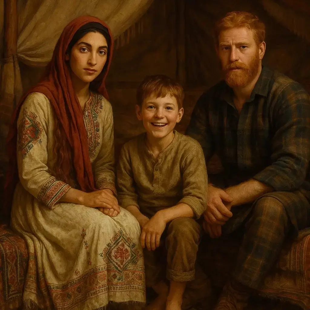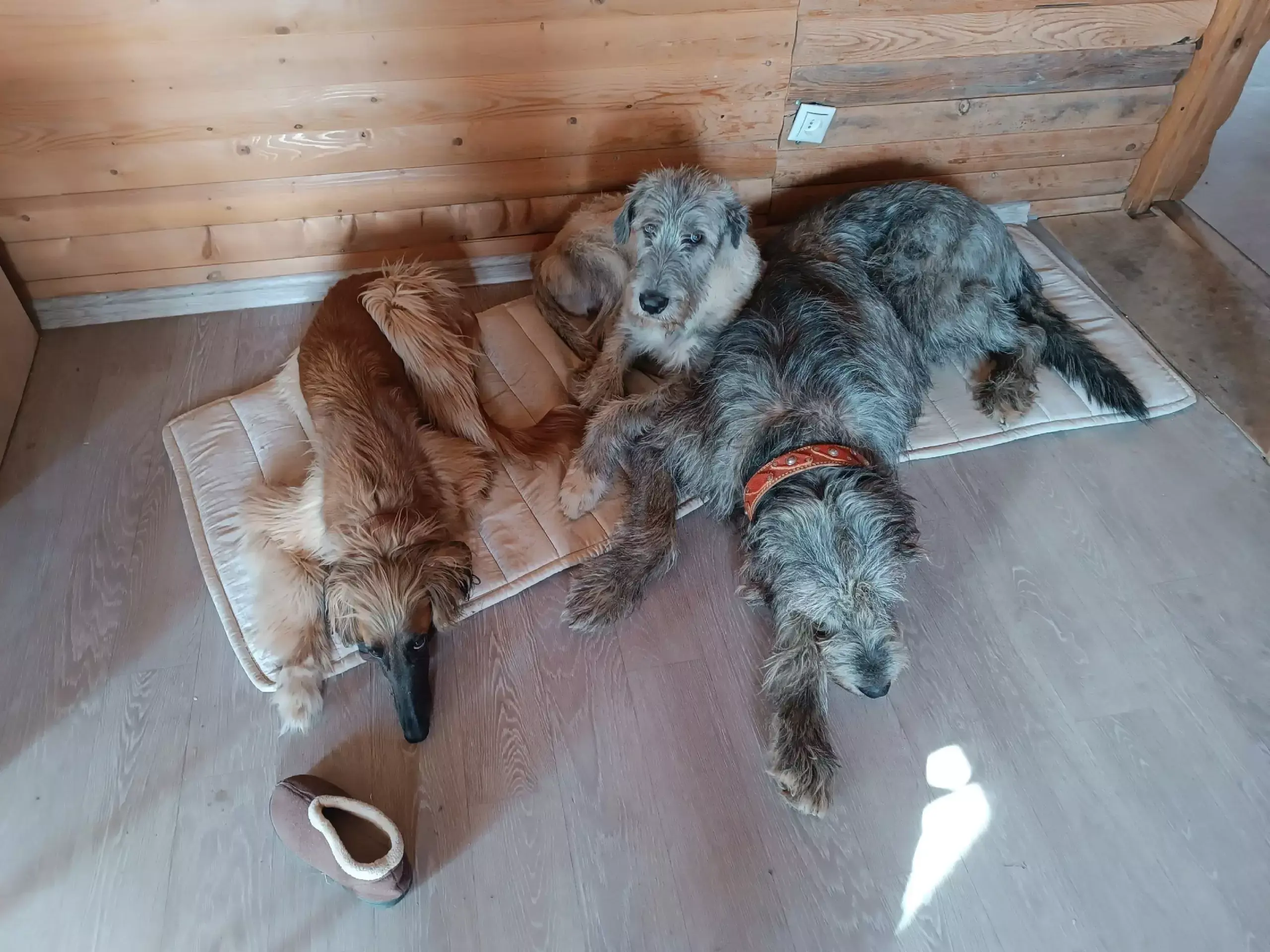 Ирландско-афганская семья. На лице отца семейства мировая скорбь ирландского народа (как в жизни) и, похоже, следы легкого похмелья. Красотка Шая смотрит осуждающе, чего у нее и в жизни не отнять. А вот Оберон подозрительно радостный, прям как не ирландец.