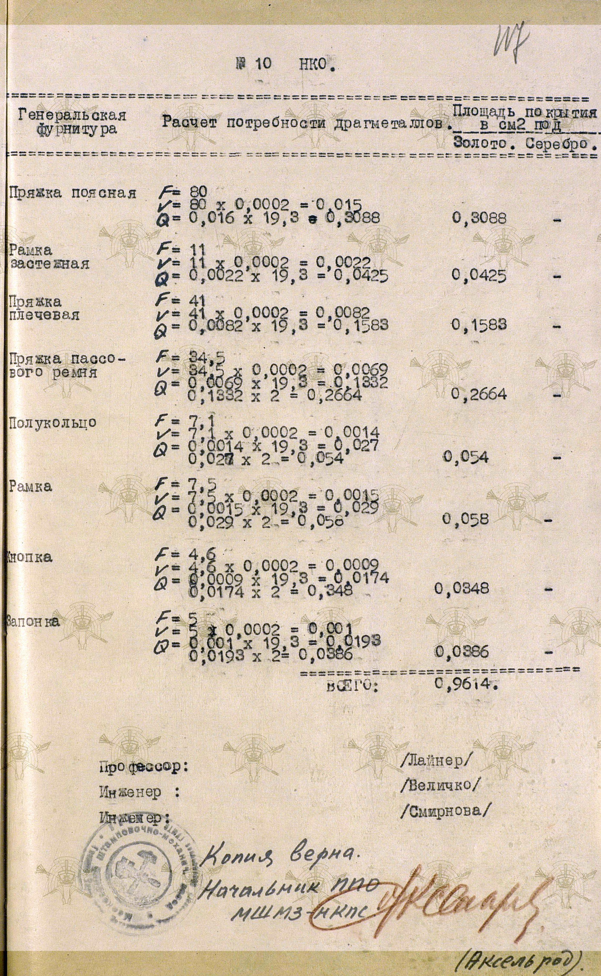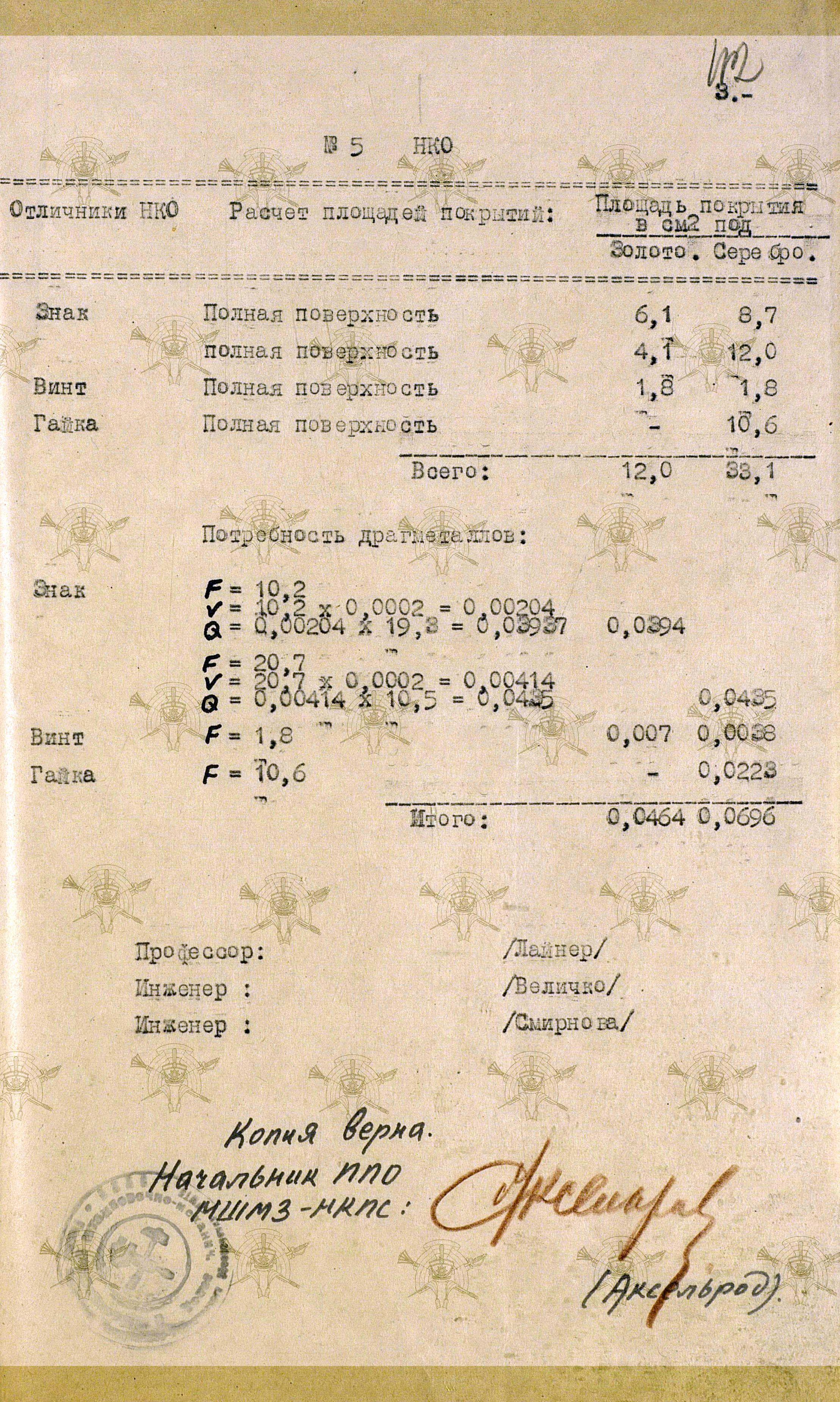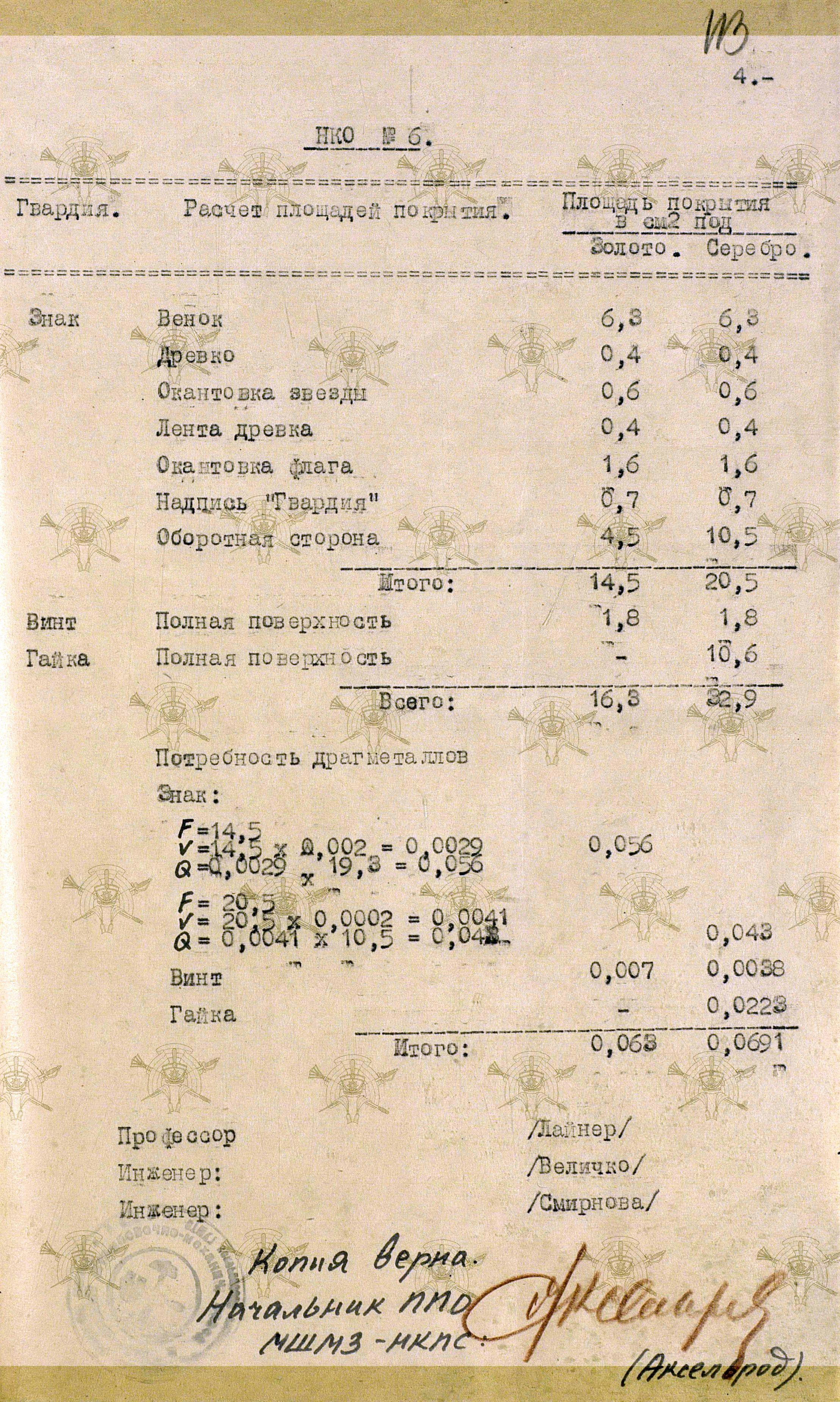 О использовании золота и серебра при изготовлении "Гвардии", "Отличника", пуговиц, эмблем и прочей фурнитуры мы уже говорили, обсуждая публикацию под названием А с небосклона бесшумным дождем падали звёзды. Оставался открытым вопрос: а где конкретно использовалось золото или серебро и сколько его расходовали. Нет, понятно, что слово "Гвардия" - позолоченное, это очевидно, а где ещё? Предлагаю предоставить слово профессору Лайнеру Владимиру Ивановичу, автору расчётов площадей покрытия и потребности драгметаллов на изделия НКО.