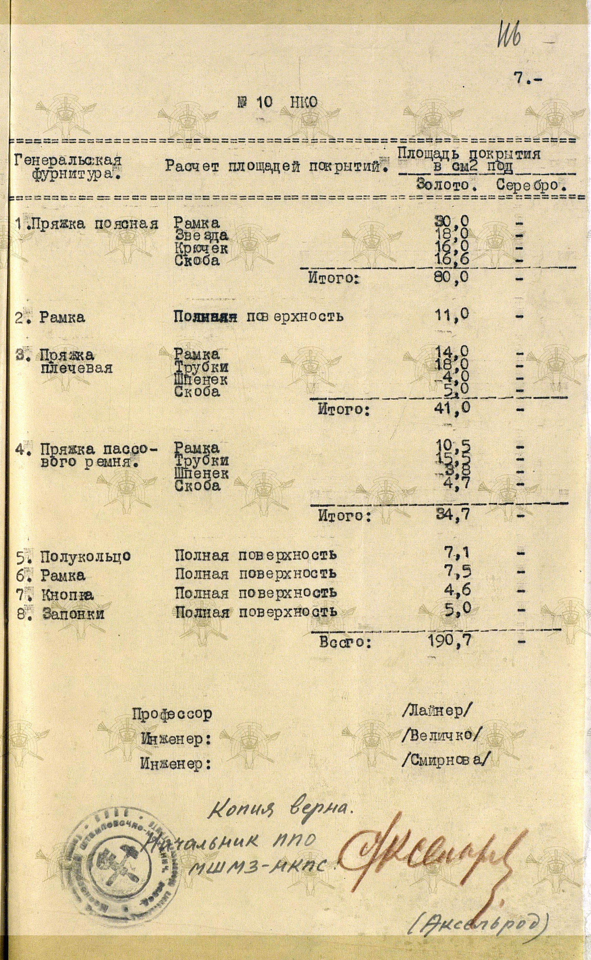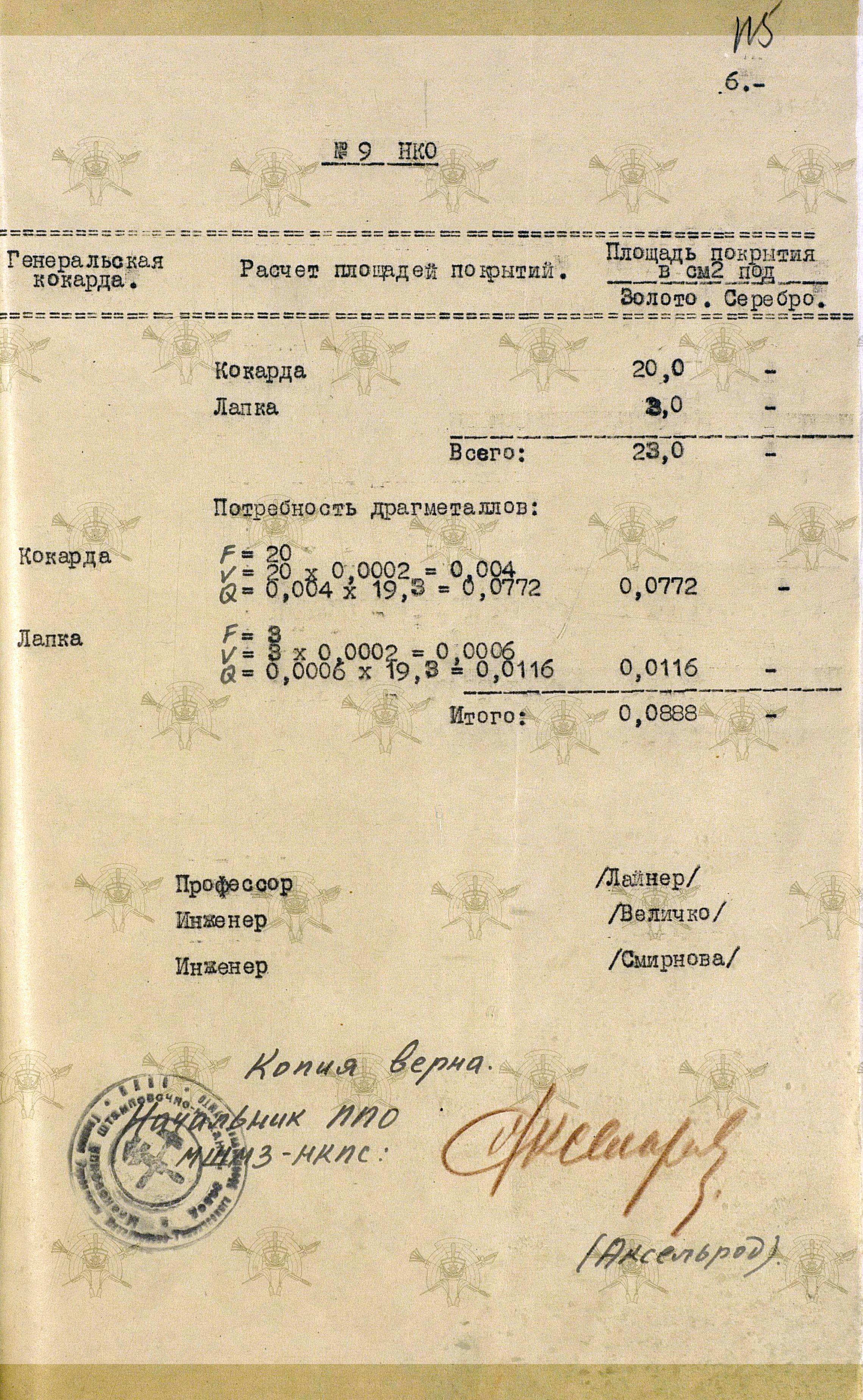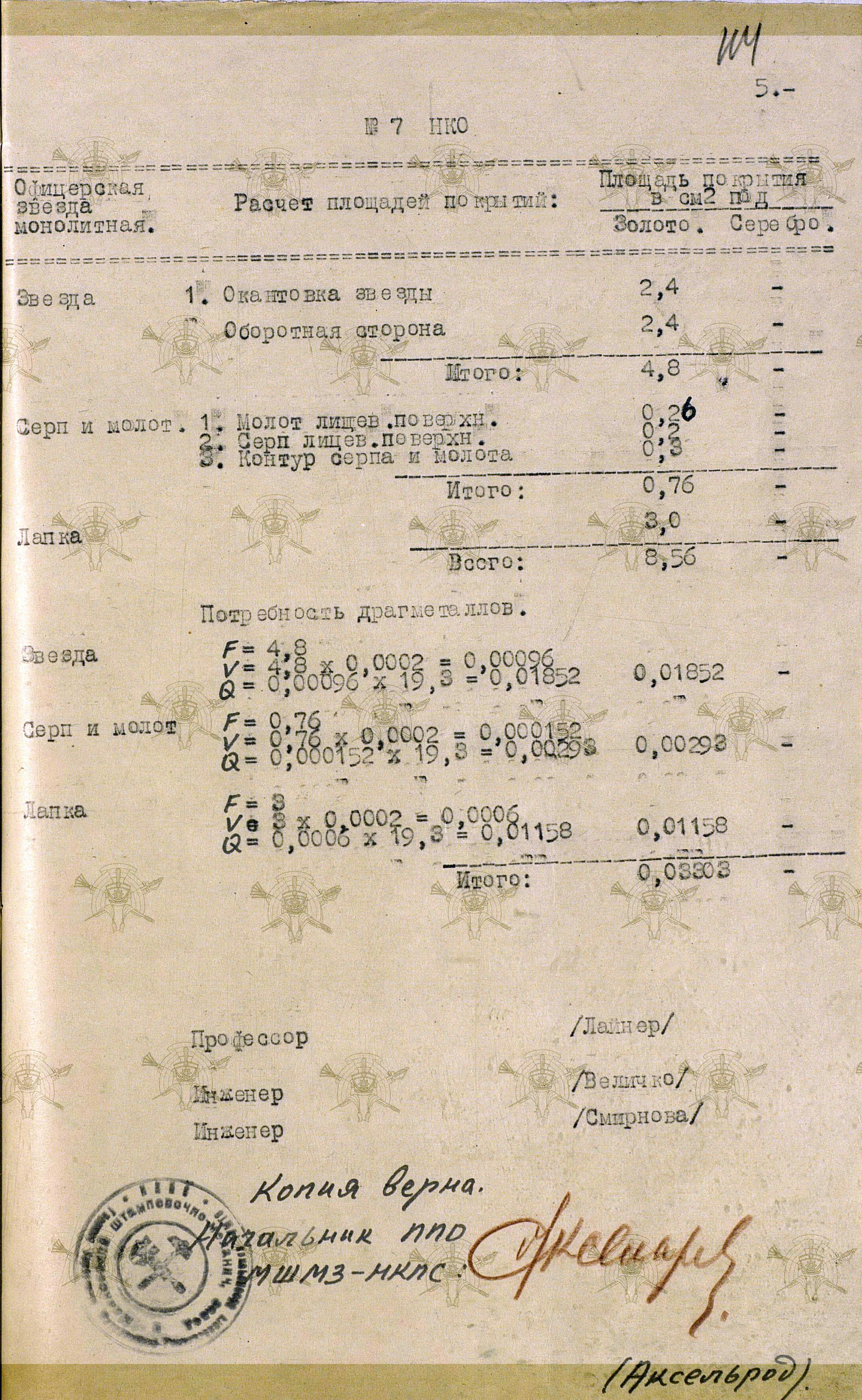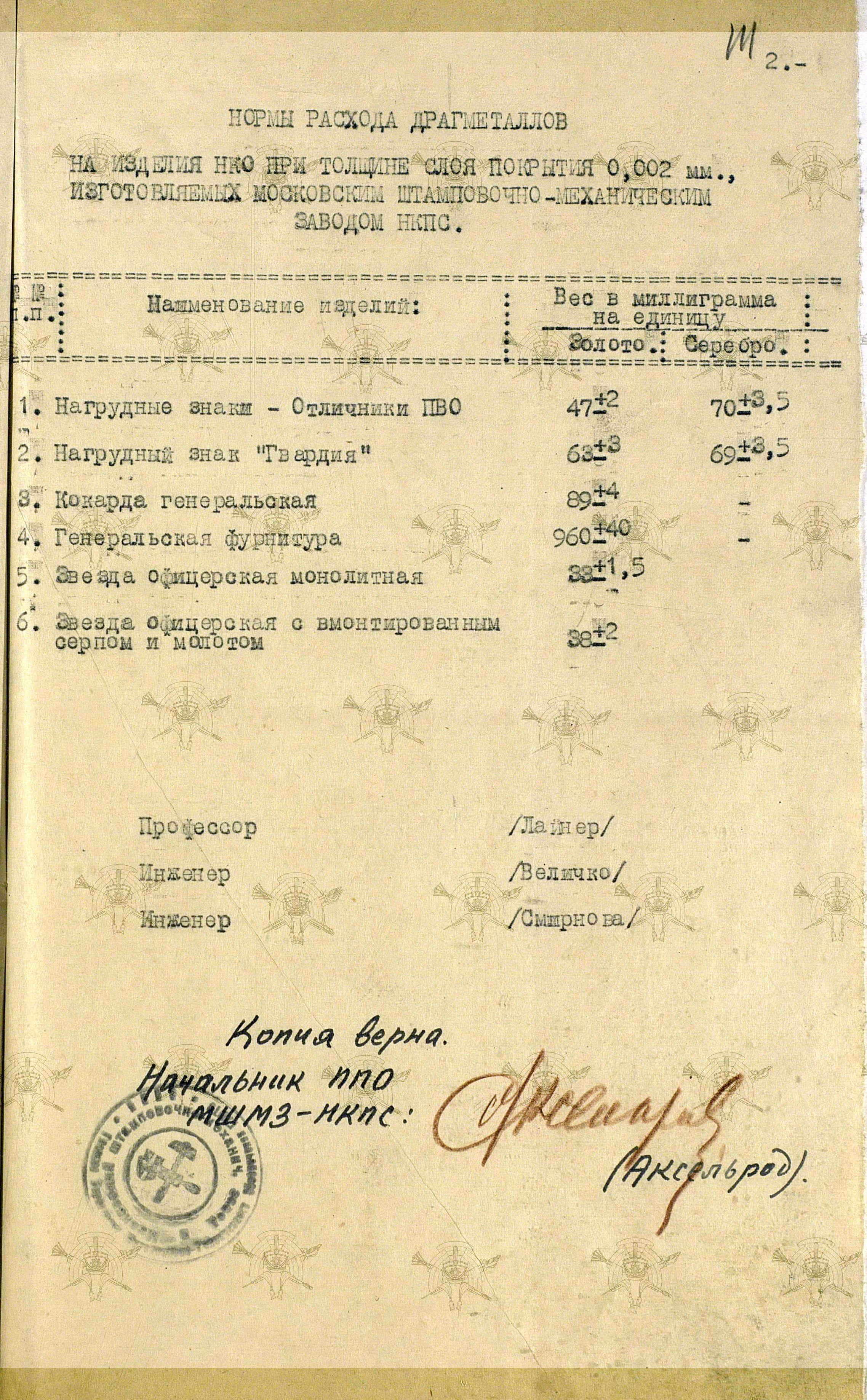 О использовании золота и серебра при изготовлении "Гвардии", "Отличника", пуговиц, эмблем и прочей фурнитуры мы уже говорили, обсуждая публикацию под названием А с небосклона бесшумным дождем падали звёзды. Оставался открытым вопрос: а где конкретно использовалось золото или серебро и сколько его расходовали. Нет, понятно, что слово "Гвардия" - позолоченное, это очевидно, а где ещё? Предлагаю предоставить слово профессору Лайнеру Владимиру Ивановичу, автору расчётов площадей покрытия и потребности драгметаллов на изделия НКО.