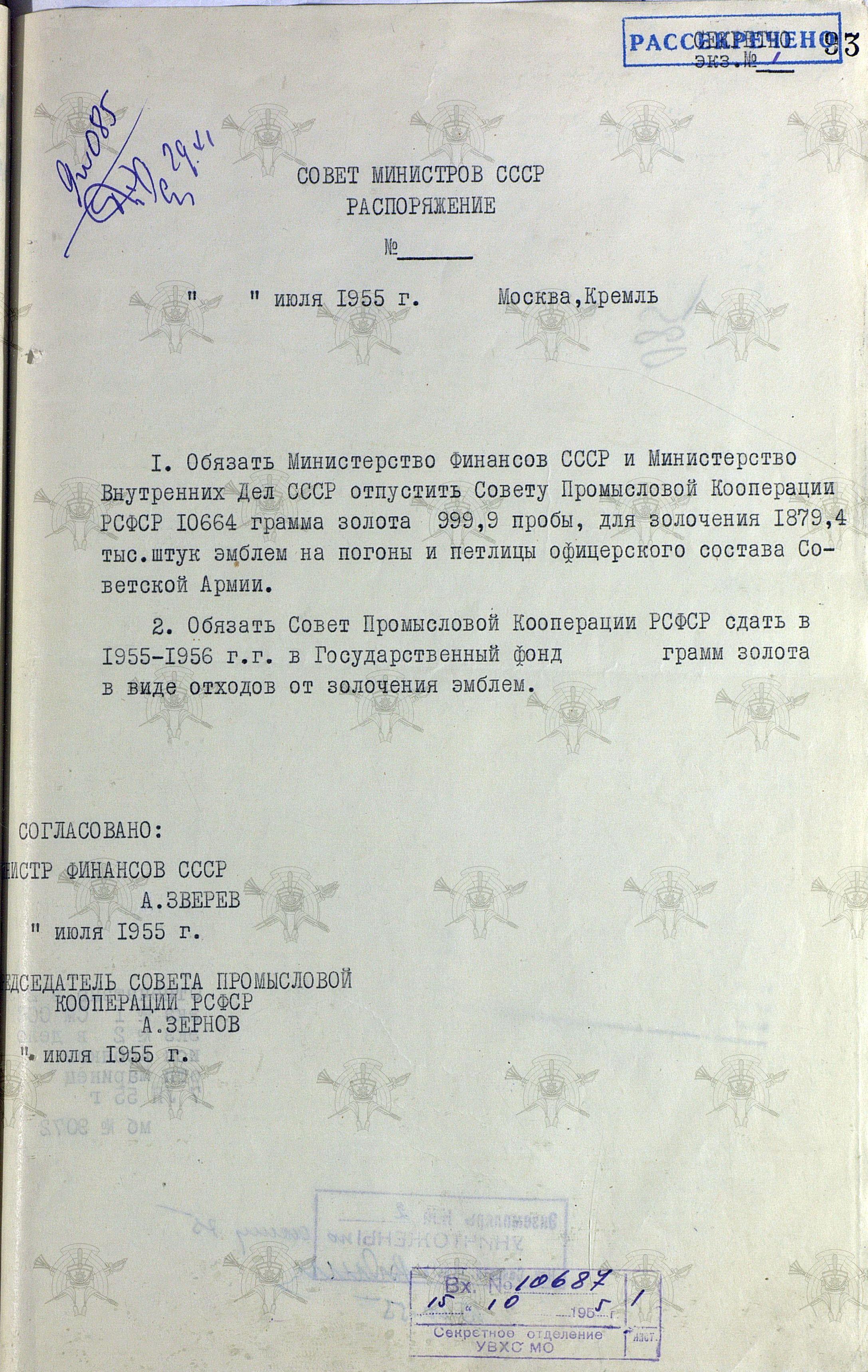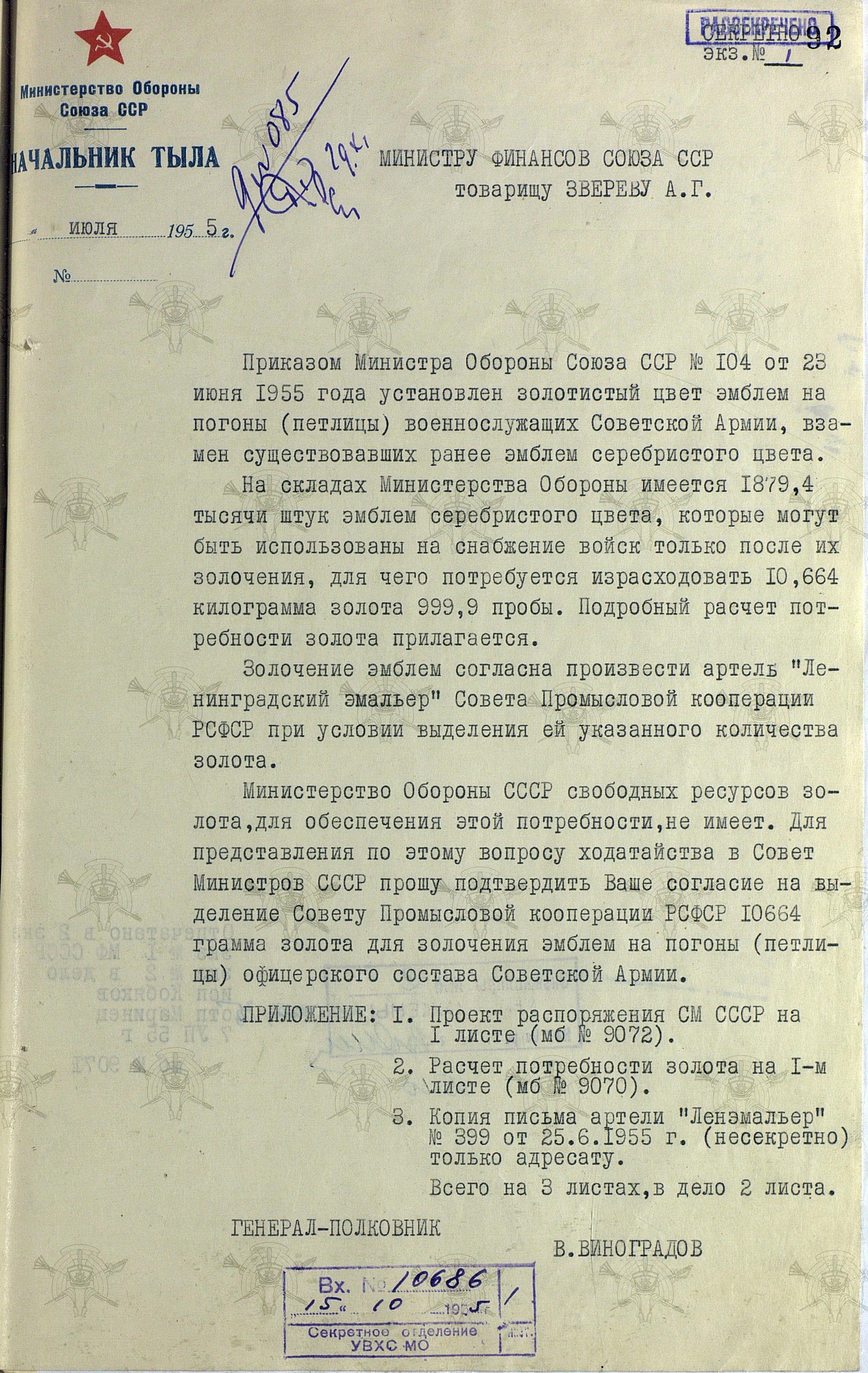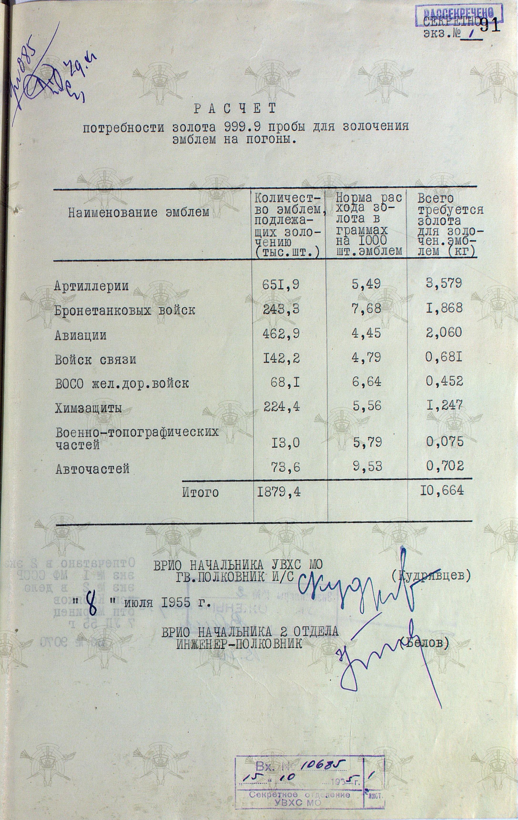 Тем более, что при изготовлении таких простых расходников как эмблемы, золото 999-й пробы использовалось даже в 1955 году. Вроде и расход невелик: 10,664 кг золота для золочения 1 879,4 тыс. эмблем, для изготовления которых уже было израсходовано серебро, но тем не менее, лишними эти золотые килограммы точно бы не стали.