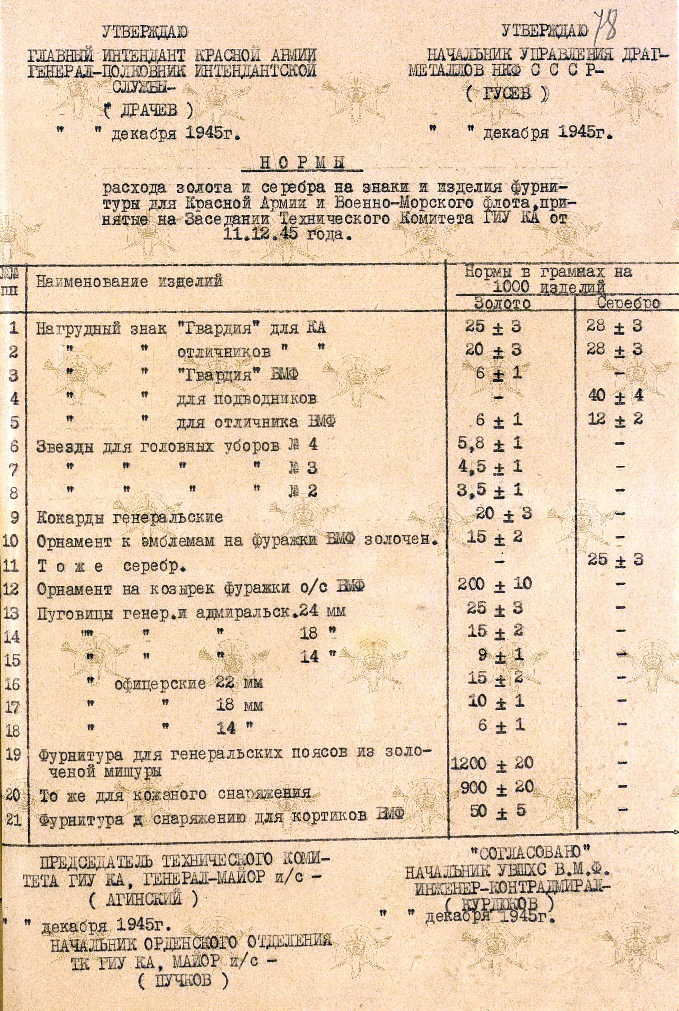 Нормы расхода драгметаллов на знаки "Гвардия", "Отличник", кокарды, звёзды и фурнитуру