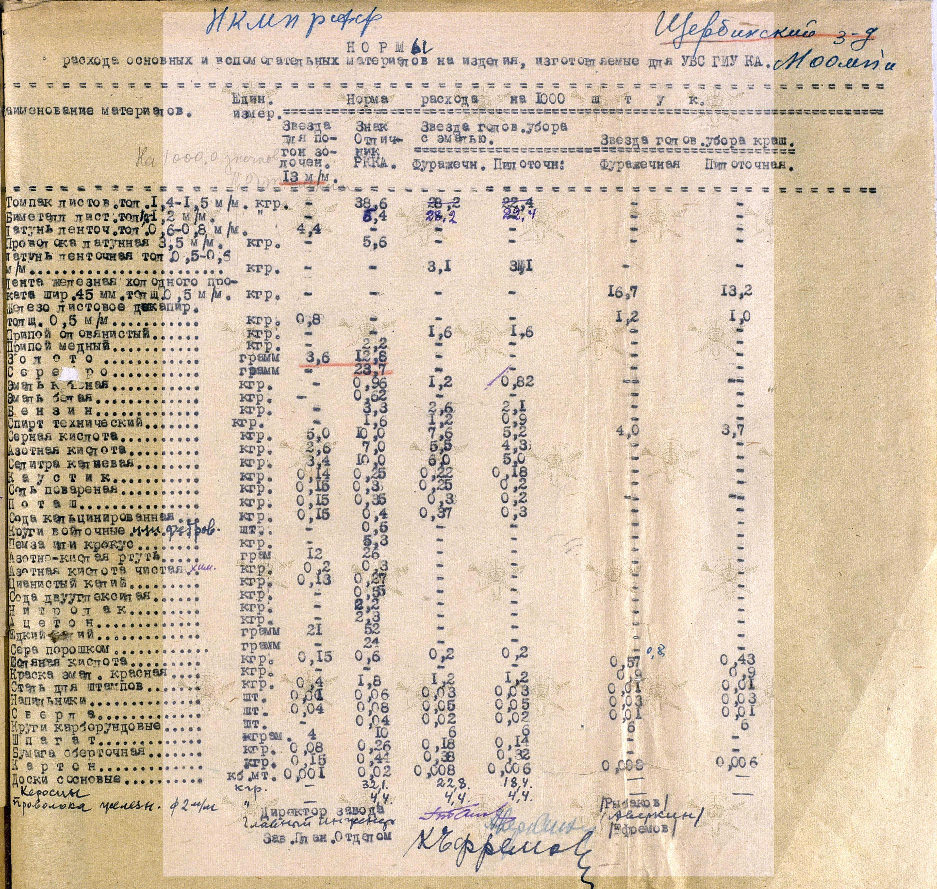 Но, если взглянуть на перечень расходных материалов, используемых для изготовлении "Гвардии", "Отличника", звёздочек фуражечных и пилоточных, то чего там только нет, включая цианистый калий, напильники, керосин и даже доски:
