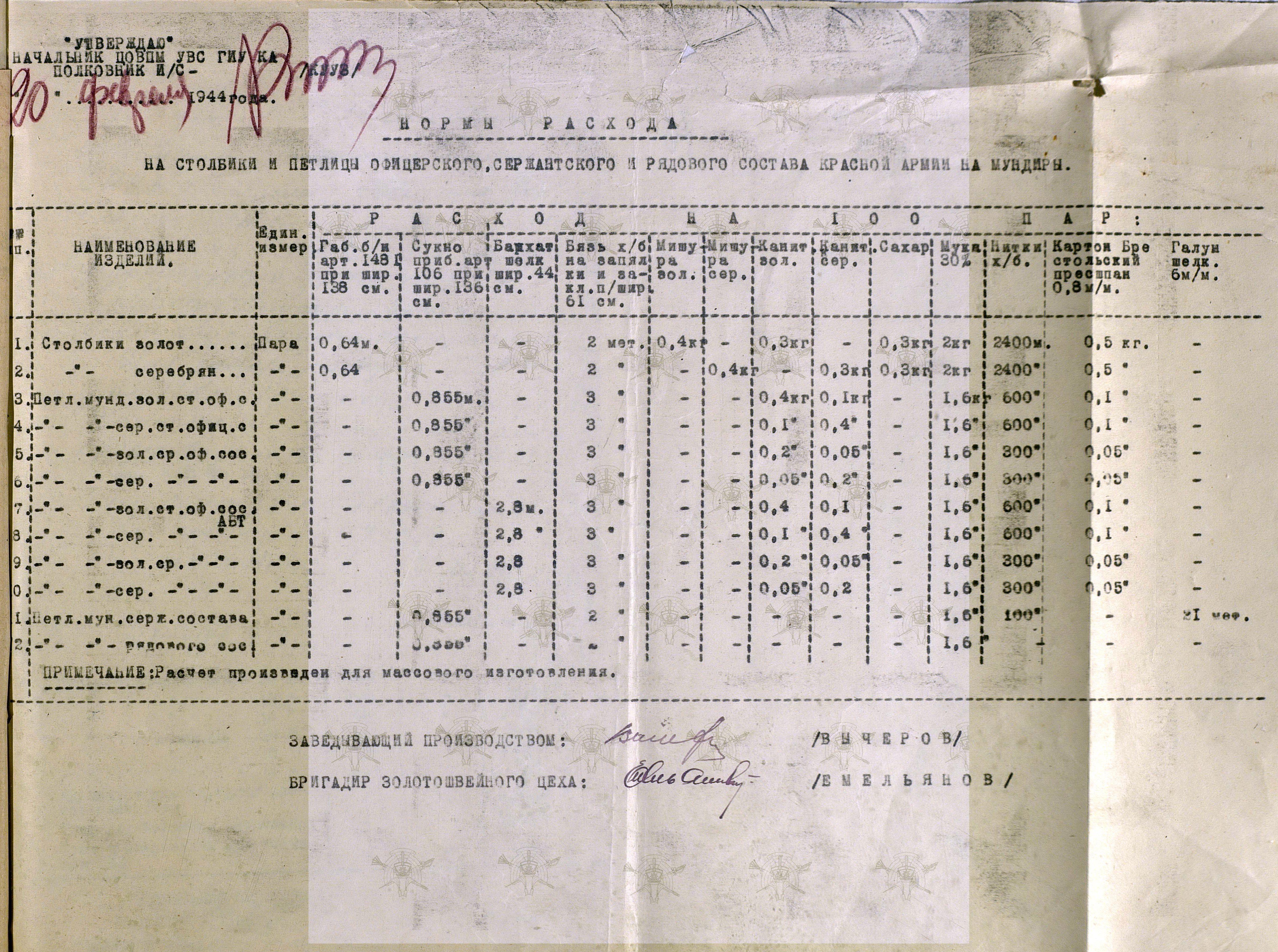 Итогом работы профессора В.И. Лайнера стали "Нормы расхода золота и серебра на знаки и изделия фурнитуры для Красной Армии и Военно-Морского флота СССР", подписанные и согласованные председателем Техкома ГИнтУ генералом С.В. Агинским, начальником Управления вещевого и шхиперско-хозяйственного снабжения ВМФ адмиралом А.И. Курдюковым, утверждённые Главным Интендантом КА генералом П.И. Драчёвым и начальником Управления драгоценных металлов Министерства финансов СССР С. Гусевым.