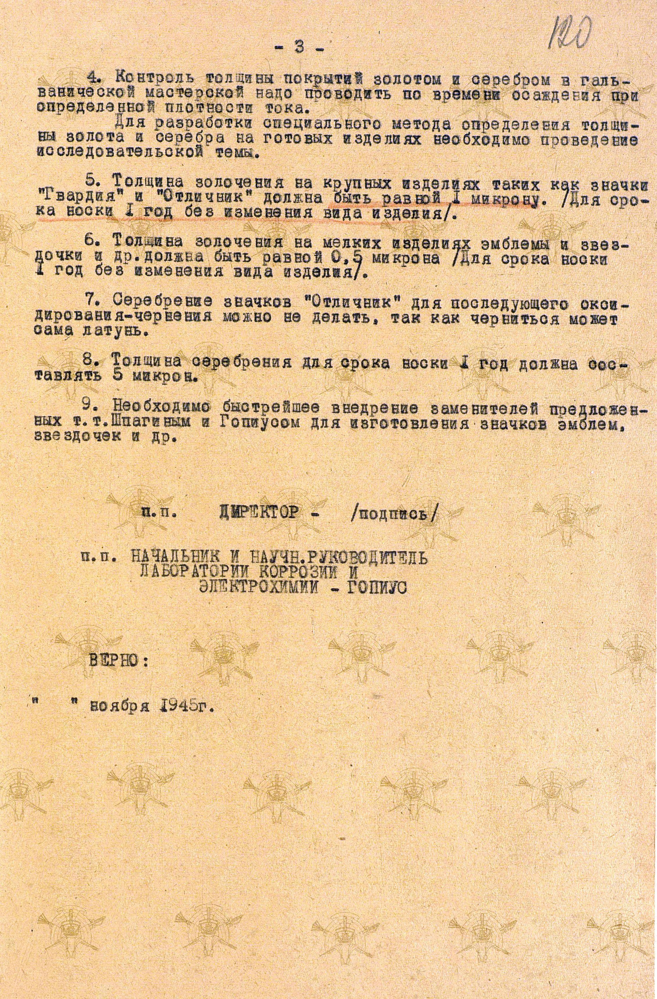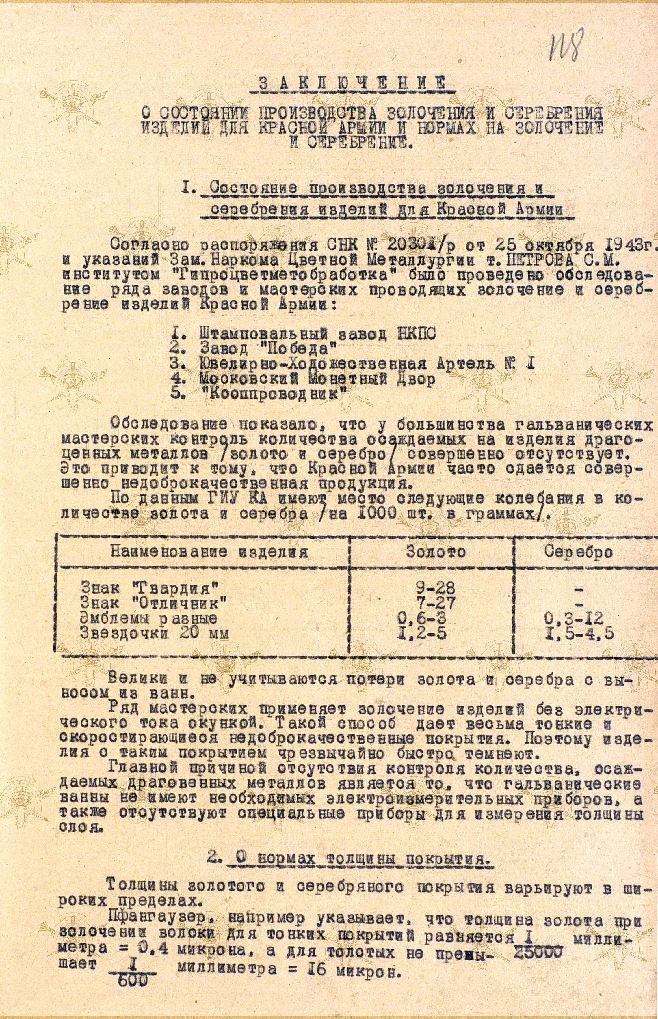 Но, нормы, конечно, дело хорошее, а вот их практическая реализация может дать результат, не совпадающий с ожидаемым. А потом коллекционеры дискутируют: почему позолота на одной "Гвардии" совсем стёрлась, а другой, произведённый в то же время знак выглядит почти как новенький. А ответ в Заключении, выложенном ниже: