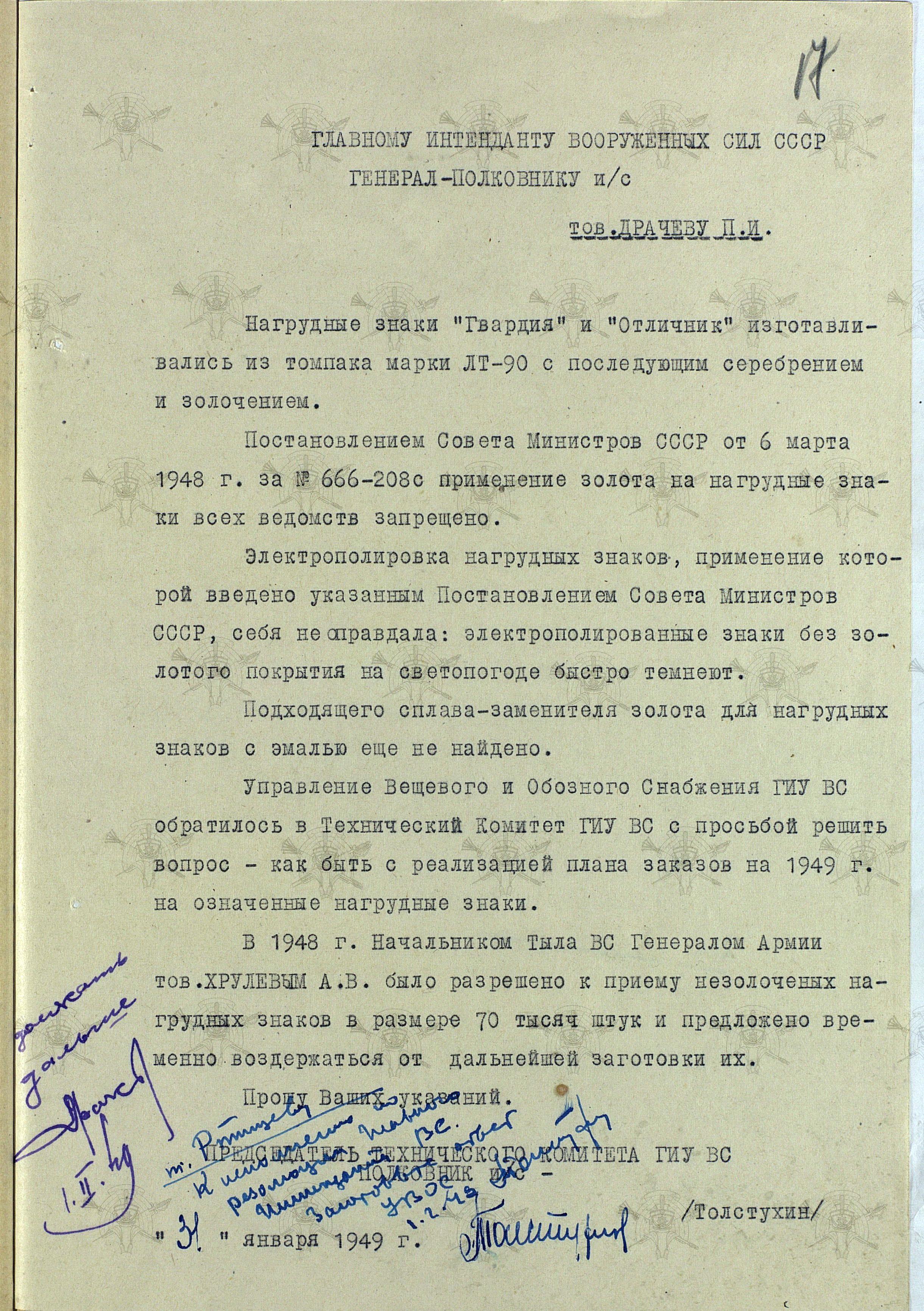 Так когда интенданты отказались от драгметаллов? Например, применение золочения при изготовлении знаков "Гвардии" и "Отличник" было запрещено постановлением Совмина СССР ещё в 1948 году. Причём попытки заменить драгметаллы электрополировкой или другими сплавами себя не оправдали. Скорее всего, позднее вернулись к драгметаллам, но подтверждения или опровержения этому пока не нашёл.