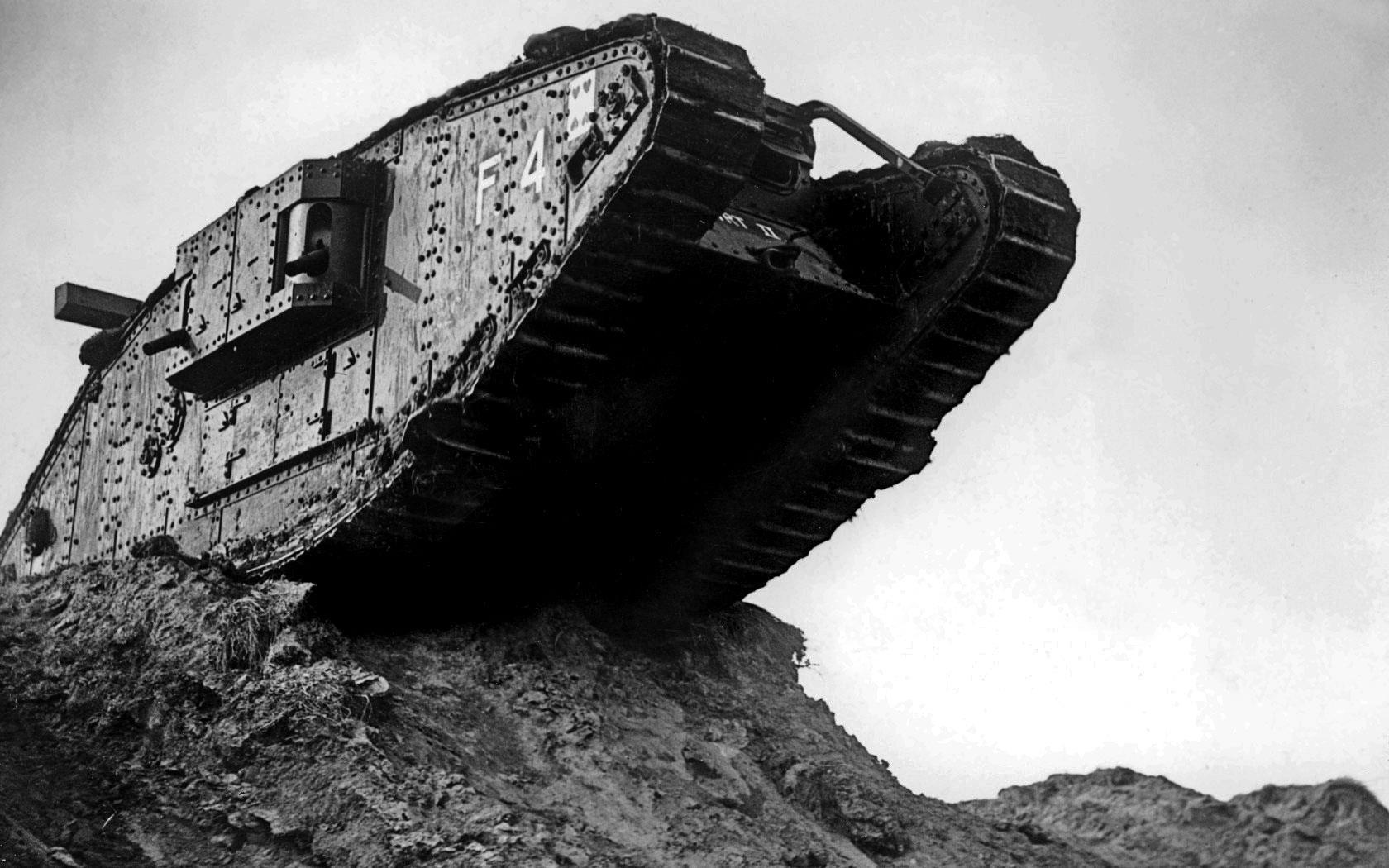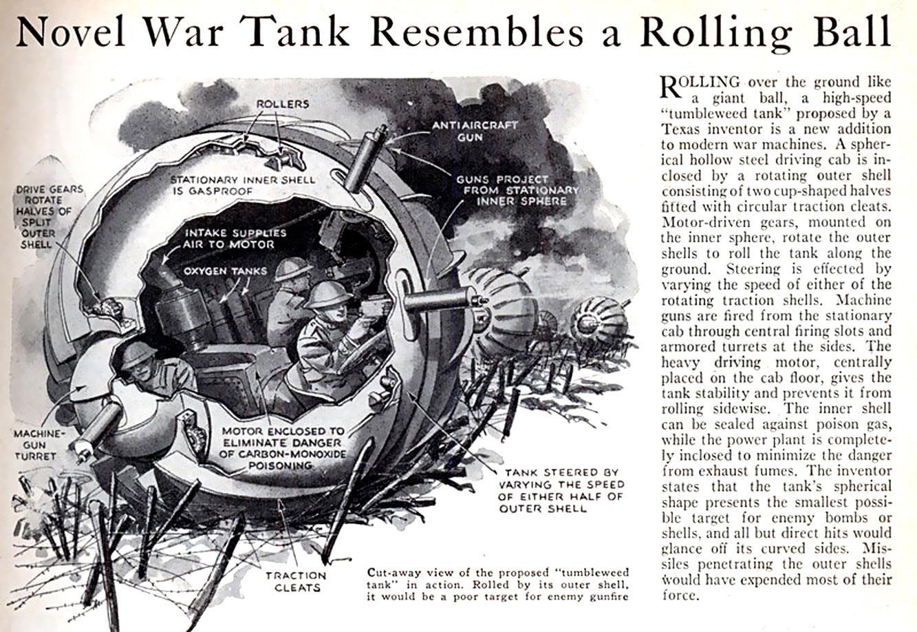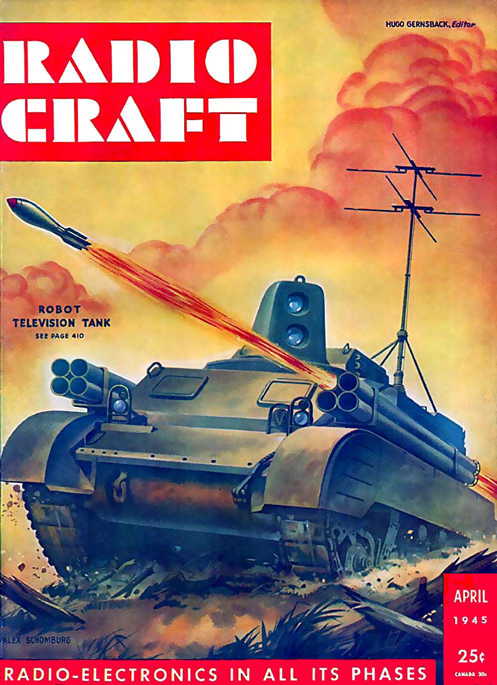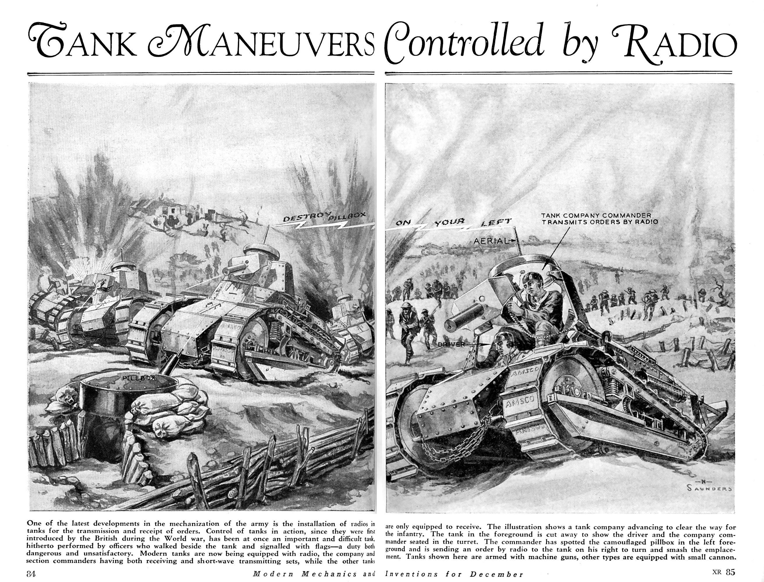 Иллюстрация из 30-х годов - атака противника на радиоуправляемых танках. Командование идет с обитаемого танка, идущего позади остальных машин