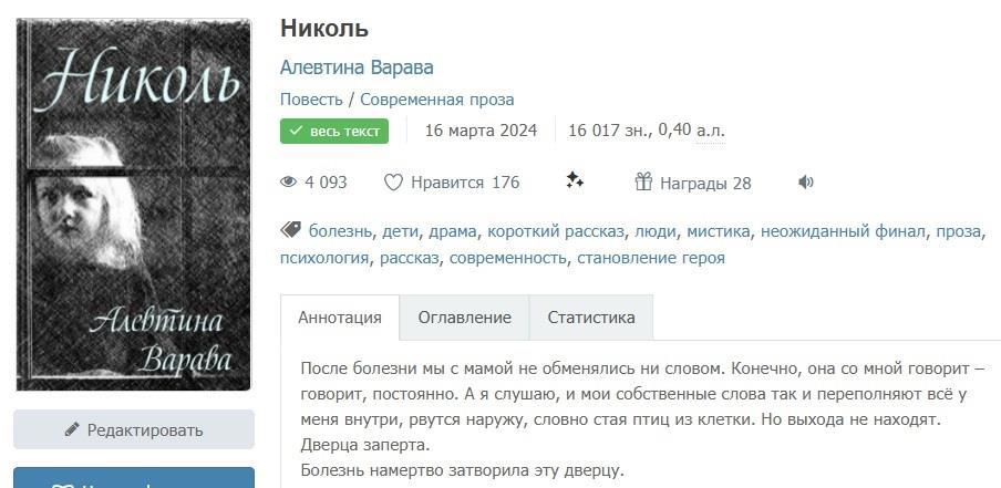 Автор: Алевтина ВараваКому-то история Николь покажется просто грустной, но очевидной. А кого-то потрясёт. Мой муж после этого рассказа впервые признал, чтоя — писатель. Хотя нельзя исключать, что он просто жалует только короткую художественную форму. Сегодня микро-повесть Николь можно дочитать до конца всего за 9,8 руб. Основную часть копирую сюда. А развязка по ссылке...