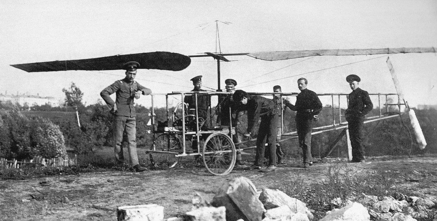 Всё просто и логично – два винта, которые вращаются в разные стороны. Казалось бы, куда ещё проще? Но всё же можно и проще… Позже, в 1910 году Борис Николаевич Юрьев придумал схему вертолёта с одним подъёмным винтом. Ещё через год он же придумал автомат перекоса лопастей. Именно по такой схеме сделано большинство вертолётов в мире. Вот вертолёт Юрьева, построенный перед Первой Мировой войной, которая прервала труды будущего советского академика в этом направлении: