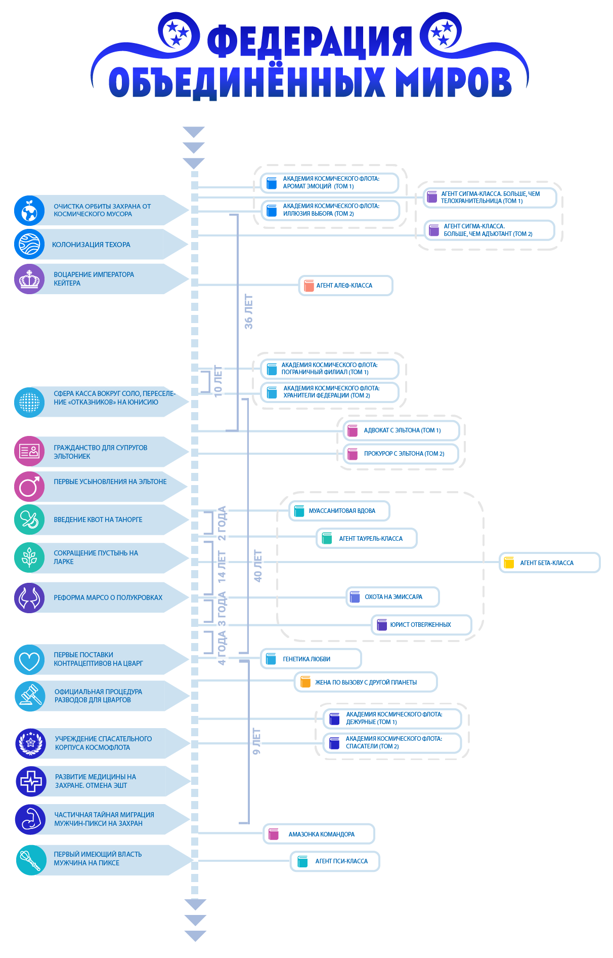 На сегодня цикл "Федерации Объединённых Миров" содержит 18 полноценных романов и ворох рассказов, бонусов и зарисовок. Все книги объединены в цикл не по сюжету или главным героям, а потому, что события происходят в одной Вселенной (планеты, расы, технические достижения).