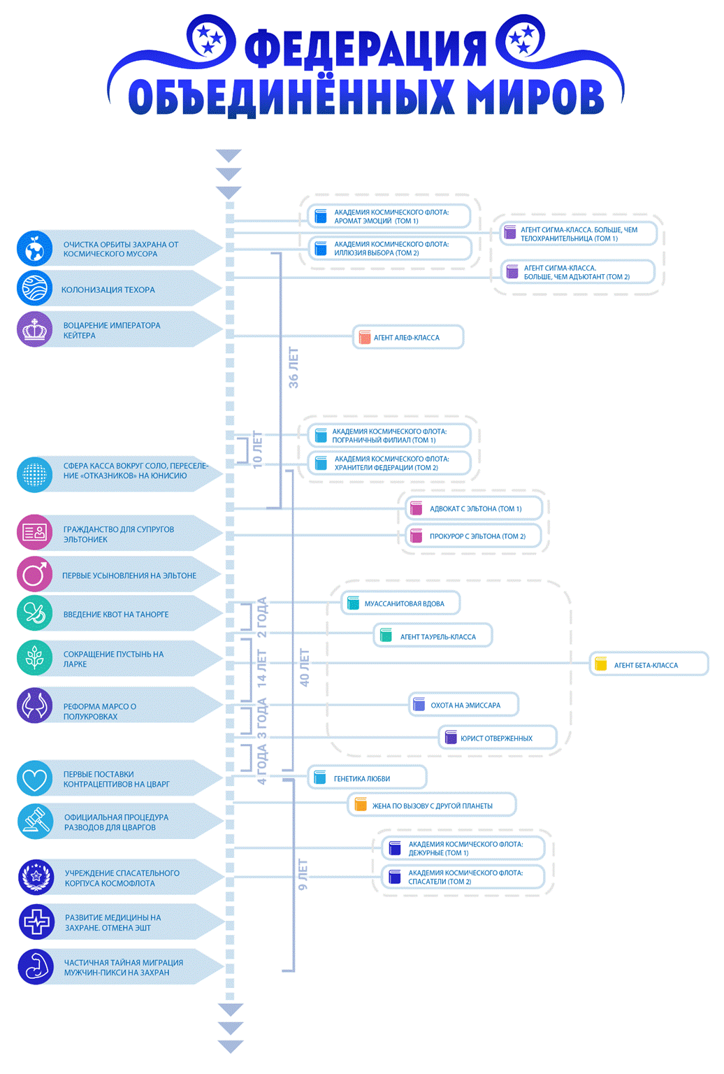На сегодня цикл "Федерации Объединённых Миров" состоит из множества полноценных романов (как серий, так и однотомников), вороха повестей, рассказов, бонусов и зарисовок. Все книги объединены в цикл не по сюжету или главным героям, а потому, что события происходят в одной Вселенной (планеты, расы и их менталитеты, технические достижения).
