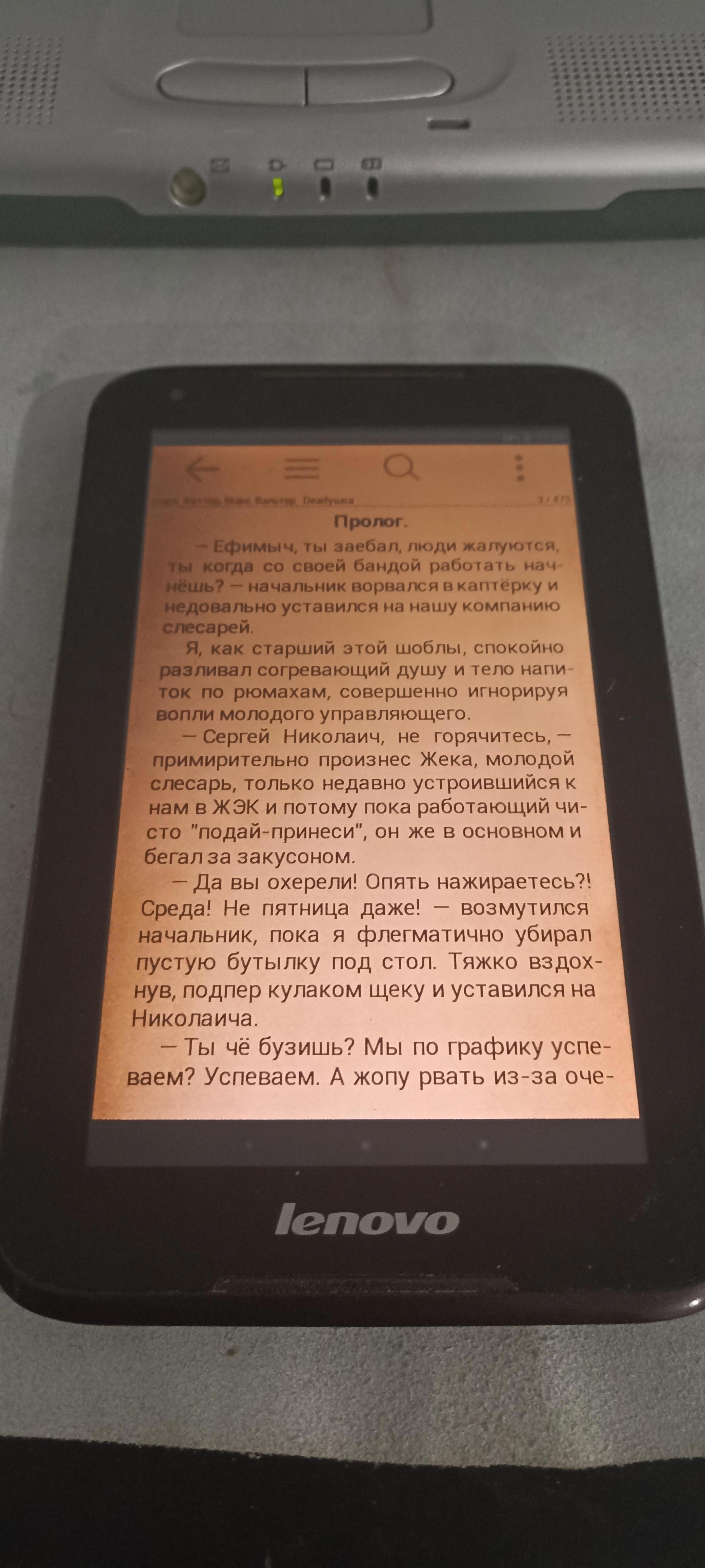 Автор: Гоп Ник ДаЗамыслил я купить читалку, Амазон киндл, посмотрел на цены, ну и как бы сразу протрезвел, норм читалка от 15 к, полез в кладовку, достал старый древний планшет Леново, которому уже лет десять, батарею держит норм хоть зачитайся