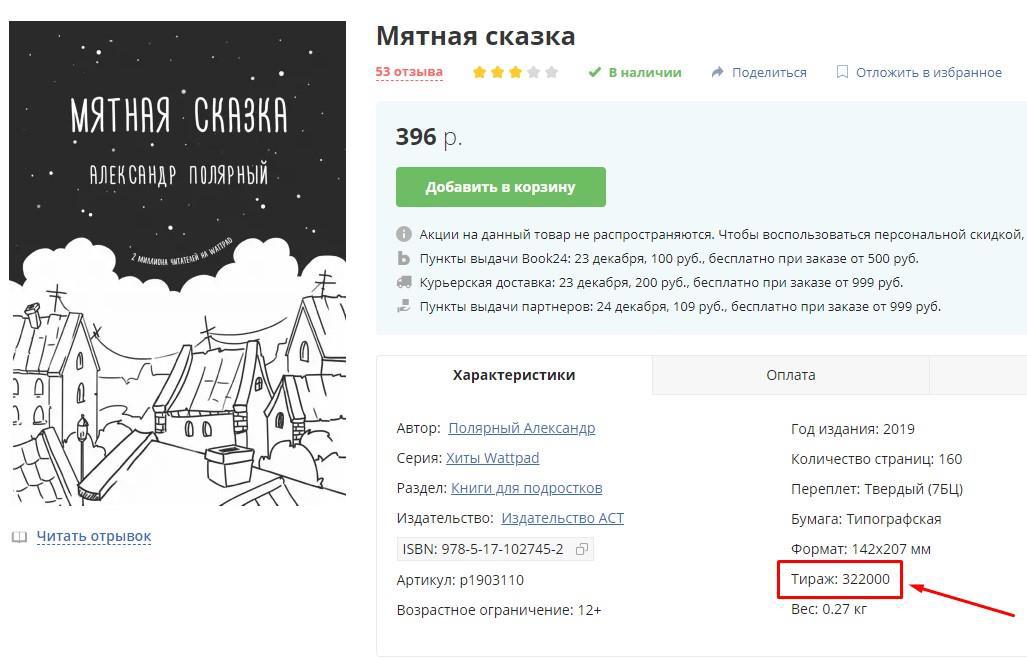 Давайте возьмем все того же Лукьяненко, и последние его книги, что там было? Квази, Порог, Маги без времени, Самоволка... Что там по тиражам? 60 тысяч у Квази, у Порога тысяч 40, еще по тридцатке у магов и самоволки. Еще вроде бы дозоры были но там совсем смешные тиражи. Итого около 160-170 тысяч общий тираж. Ну немало да, наверное один из самых продающихся авторов... Но тут мы открываем "Мятную сказку" Полярного и видим тираж почти в четыреста тысяч книг, это без допечаток и переизданий.