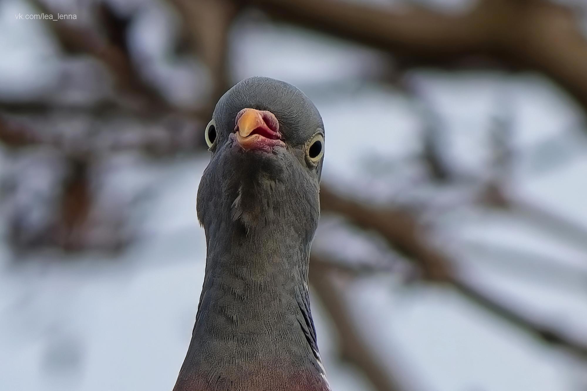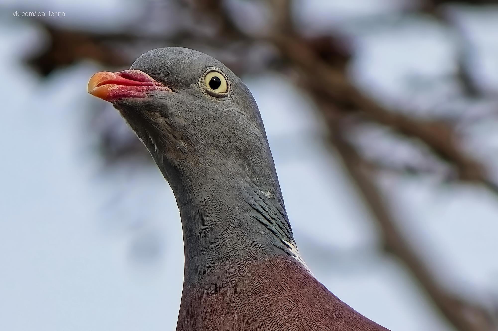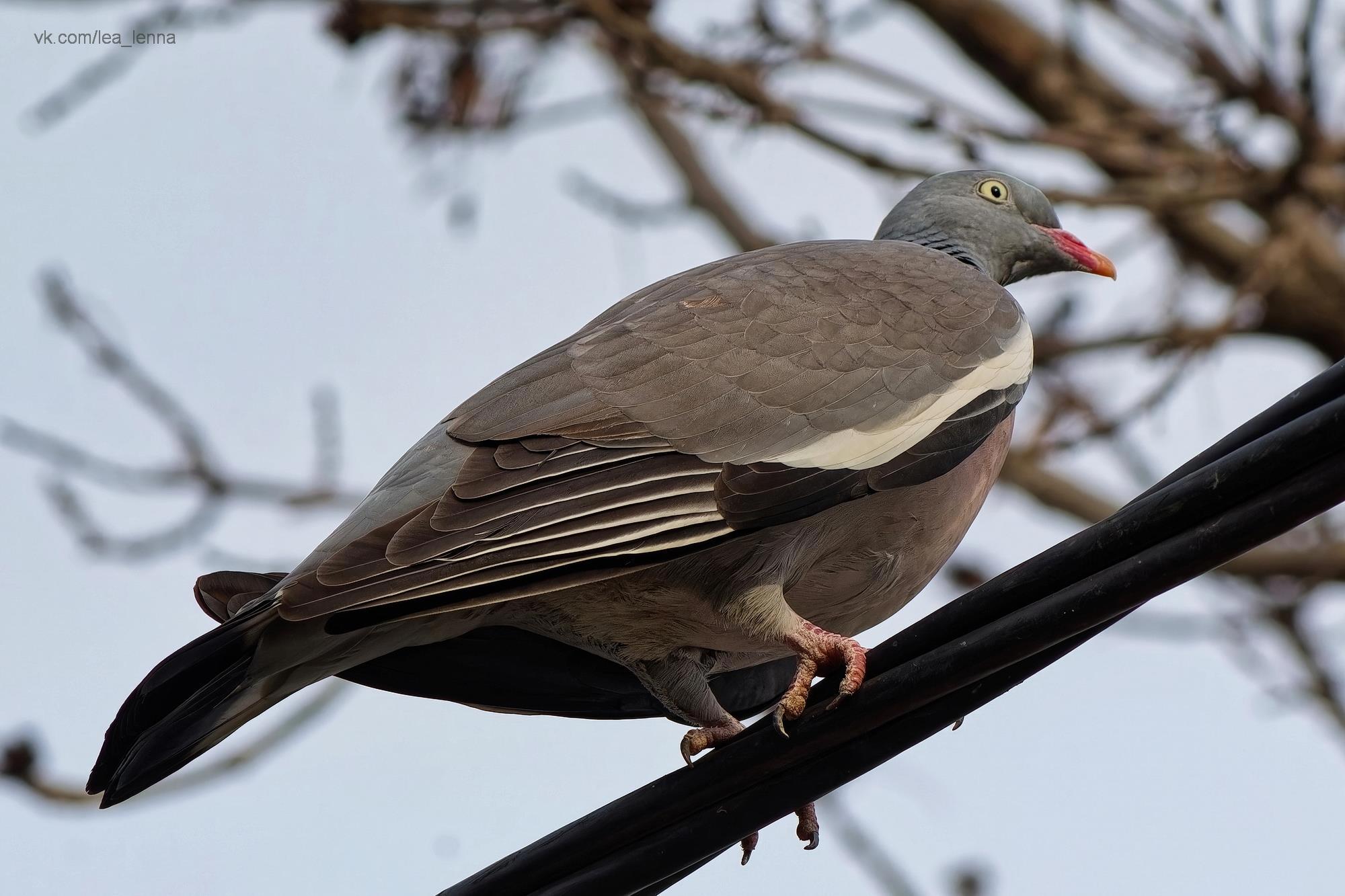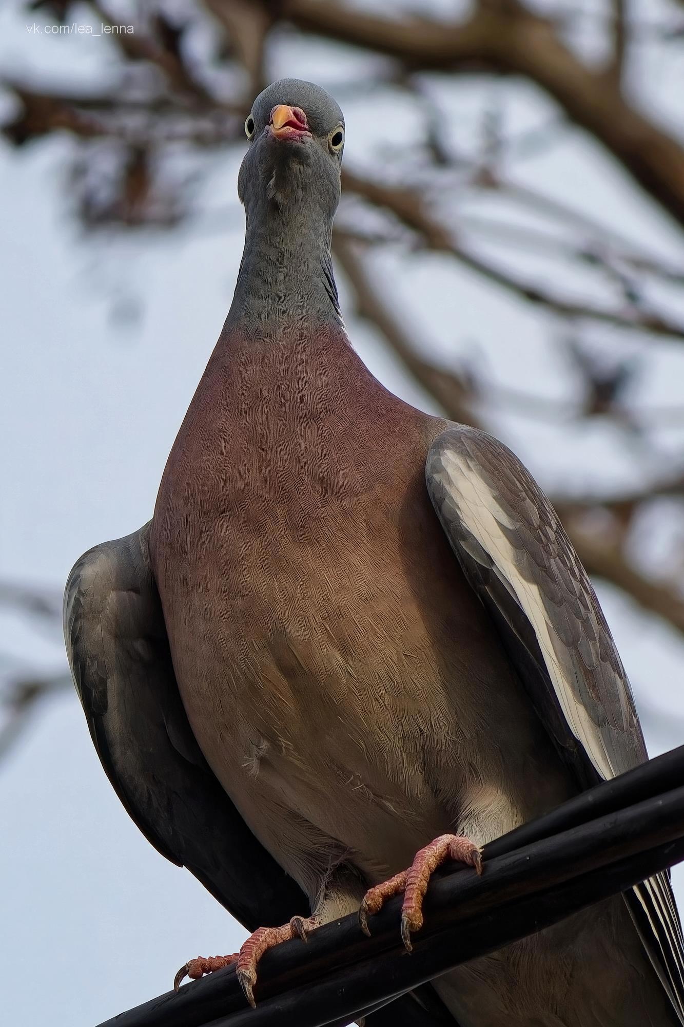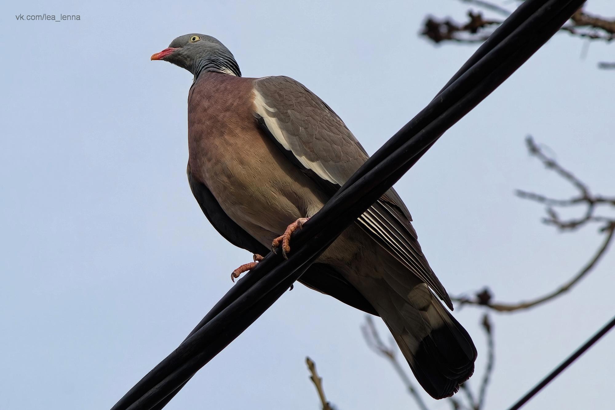 Вяхирь самый крупный голубь, весит в среднем полкилограмма. У нас довольно часто можно их увидеть в парках, а то и на окраинных улицах, этот рассматривал меня, восседая на кабеле между столбами.