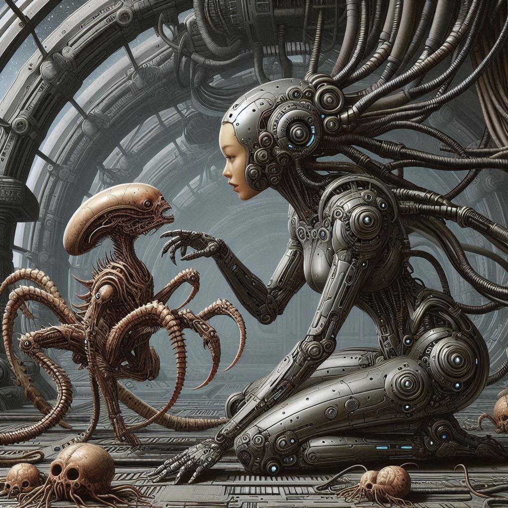 В промте и ползвука не было о Гигере, честное слово! Личное её творчество. Так я узнал, что Бинге нравится Гигер - и что мультяшной милоты с этим конкретно промтом мне от неё не видать, при том, что вообще-то Бинга может делать очень милое. Но сама идея роботов и инопланетян представляется ей пугающей - и контраст между роботом с Земли и существами из космоса Бинга как-то сгладила, почти уничтожила. И девочка, и инопланетянин выглядят почти одинаково чуждыми: