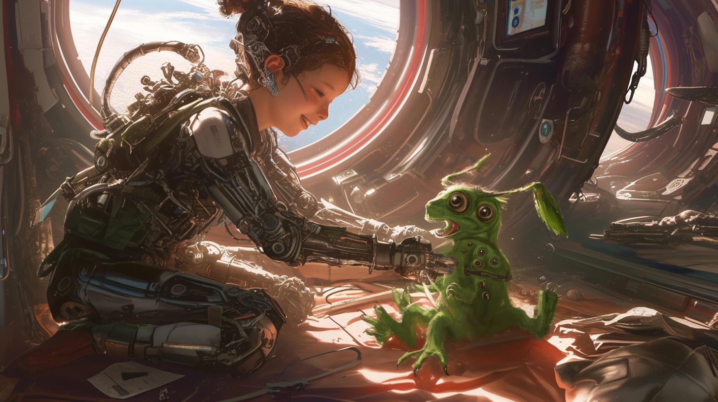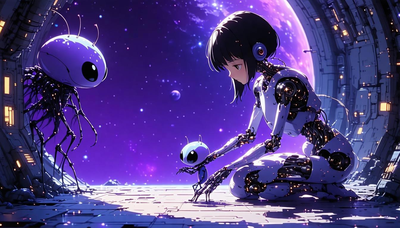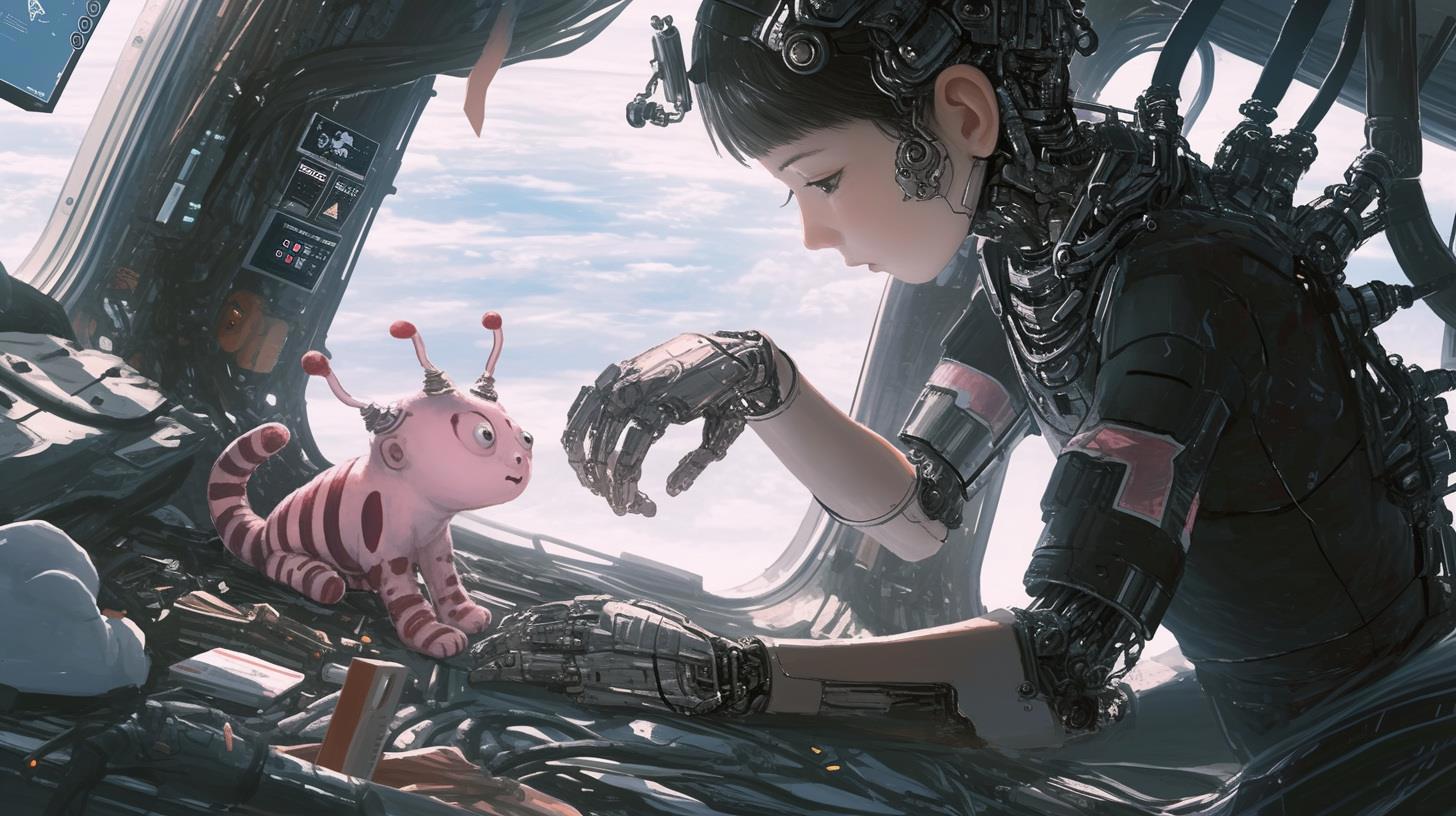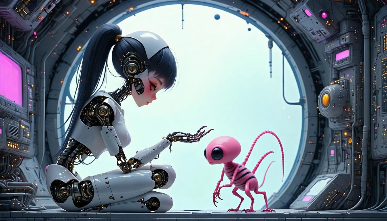 Раз сегодня у нас праздник открытого космоса - попробуем изобразить Первый Контакт! И в промте будет механическая девочка-робот, которая играет с маленьким инопланетным существом. Отметим: девочка-робот - с Земли. А существо - из глубокого космоса. Стиль - мультфильм или иллюстрация к детской книжке.
