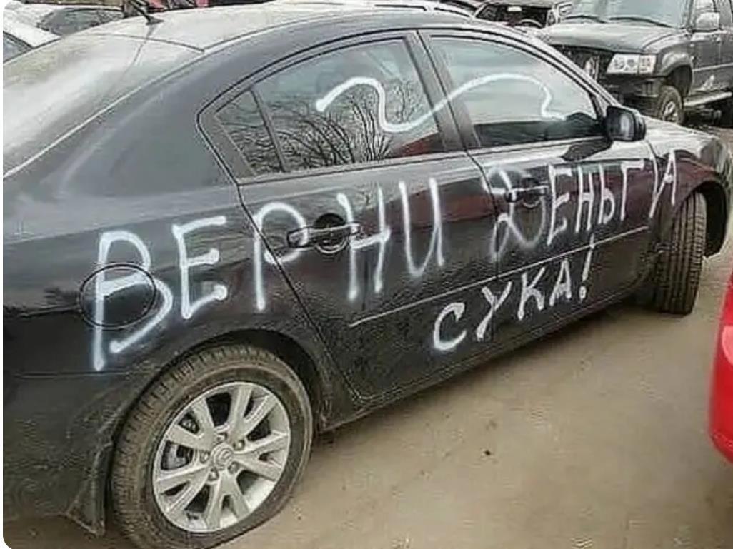 Вы вправду внимательно прочли? ДЕНЬГА!!!! Может где-то на капоте остаток фразы? « ВЕРНИ ДЕНЬГАМИ!» Но сЦуко - заднее правое колесо говорит, что не только писали, но ещё и тыкали тупым и острым…