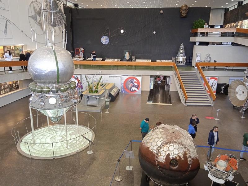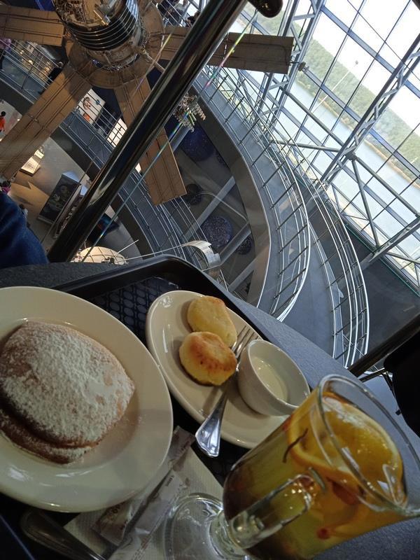 Наверху есть кафе, где можно выпить чаю и почувствовать себя в космосе, когда под тобой "летают" настоящие спутники, а на большом экране движутся планеты.